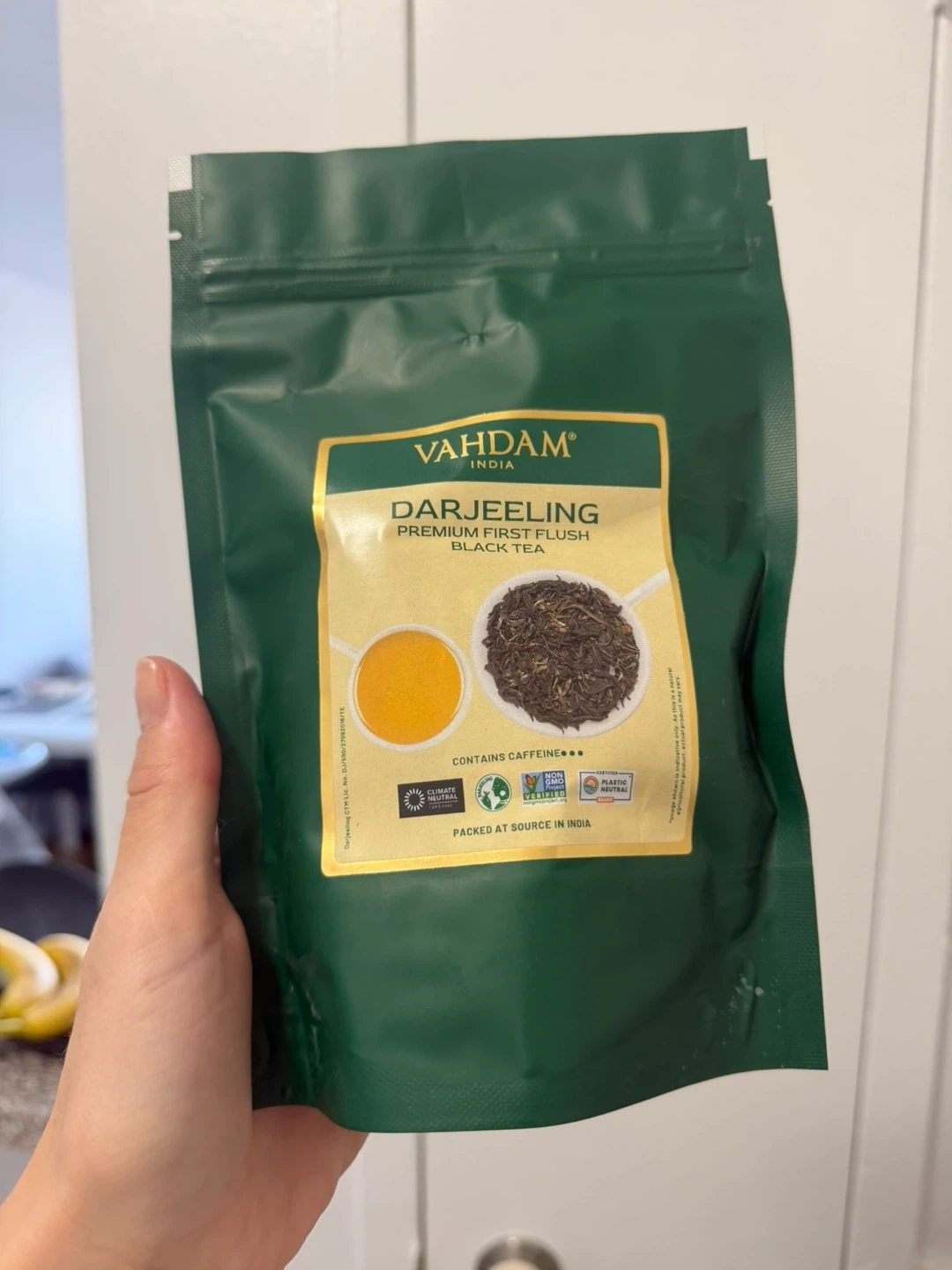 This is a bag of VAHDAM INDIA Darjeeling Premium First Flush Black Tea. It contains caffeine and is packed at source in India. Enjoy a delicious cup of tea! 100 grams