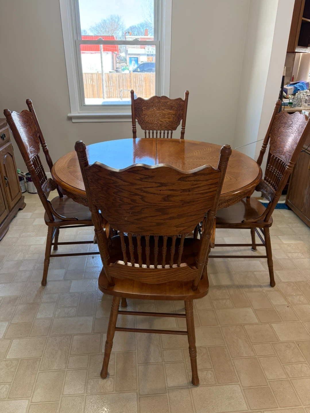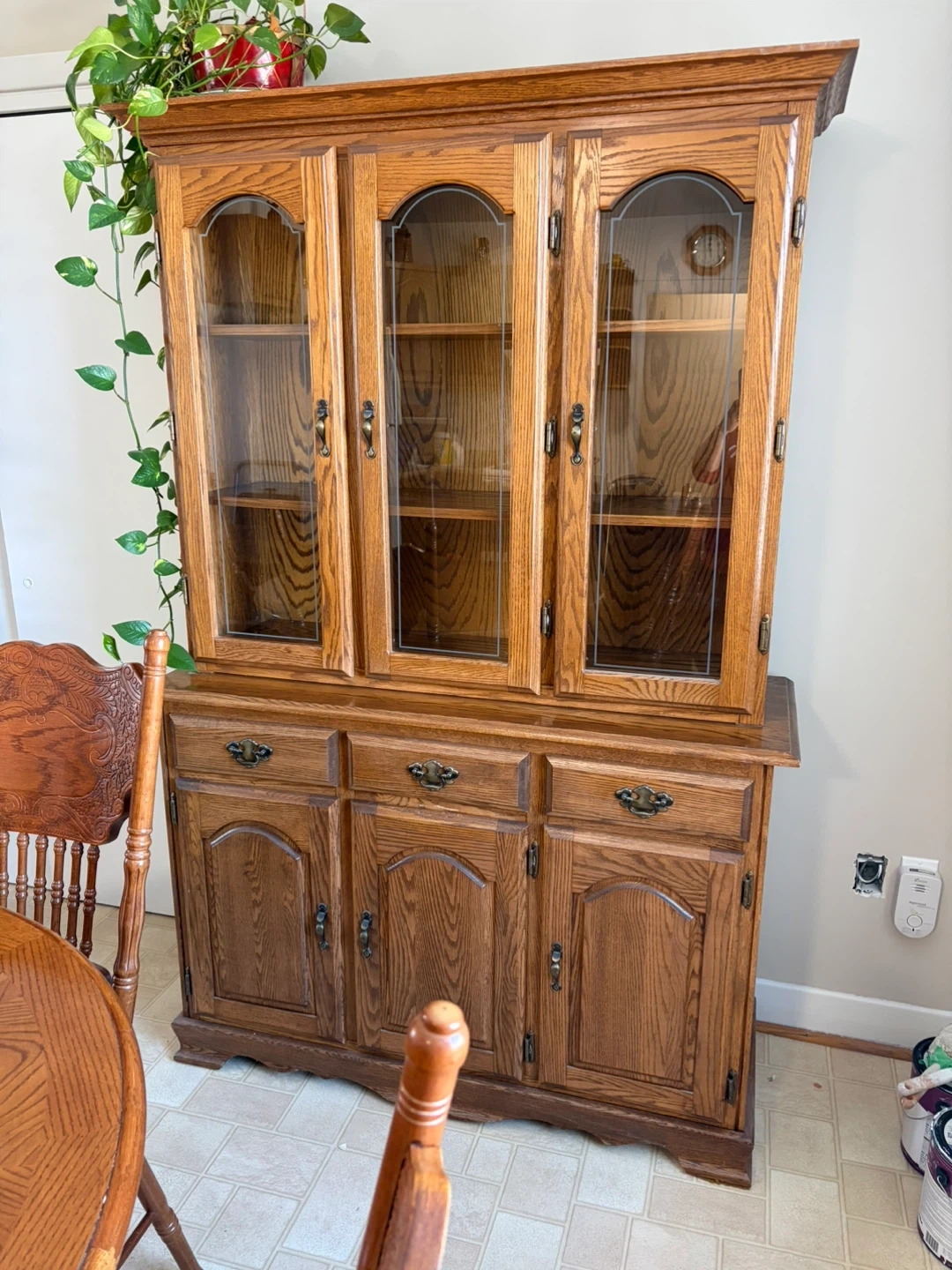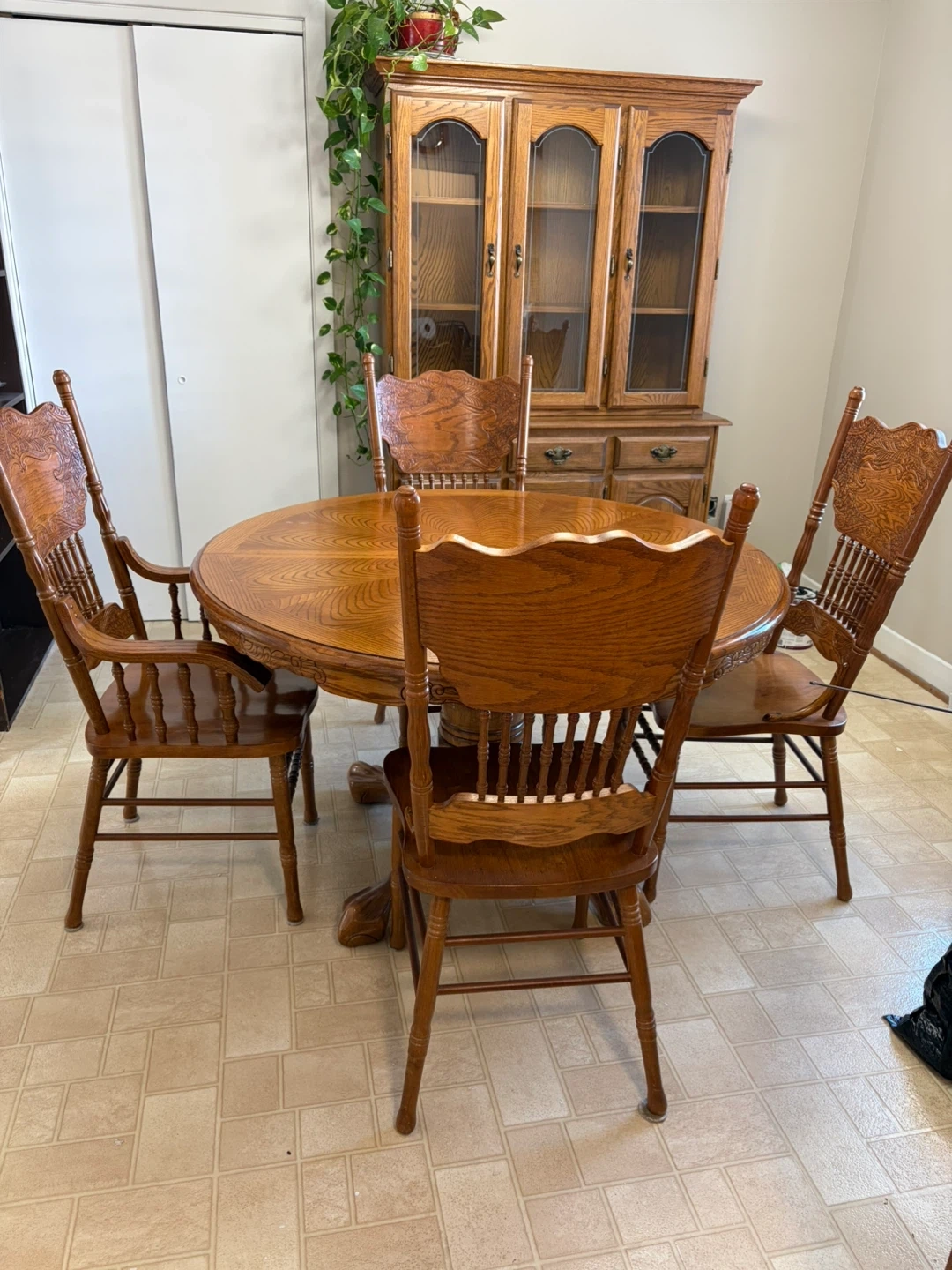This is a complete oak dining set, featuring a round table and 8 matching chairs with intricately carved backs. It also comes with a leaf. China cabinet to be sold separately or together with three glass-fronted doors up top and ample storage below. The wood has a warm, natural finish. Asking $400 per item or best offer. Oshawa