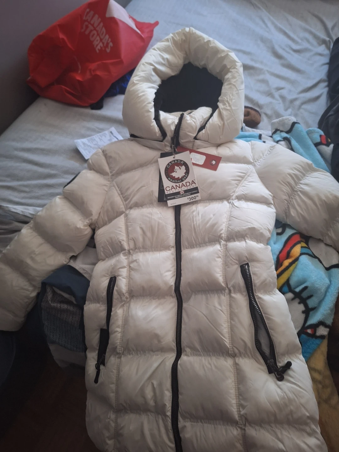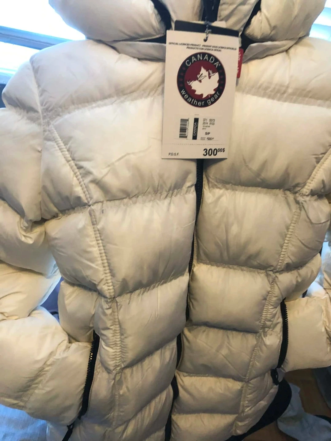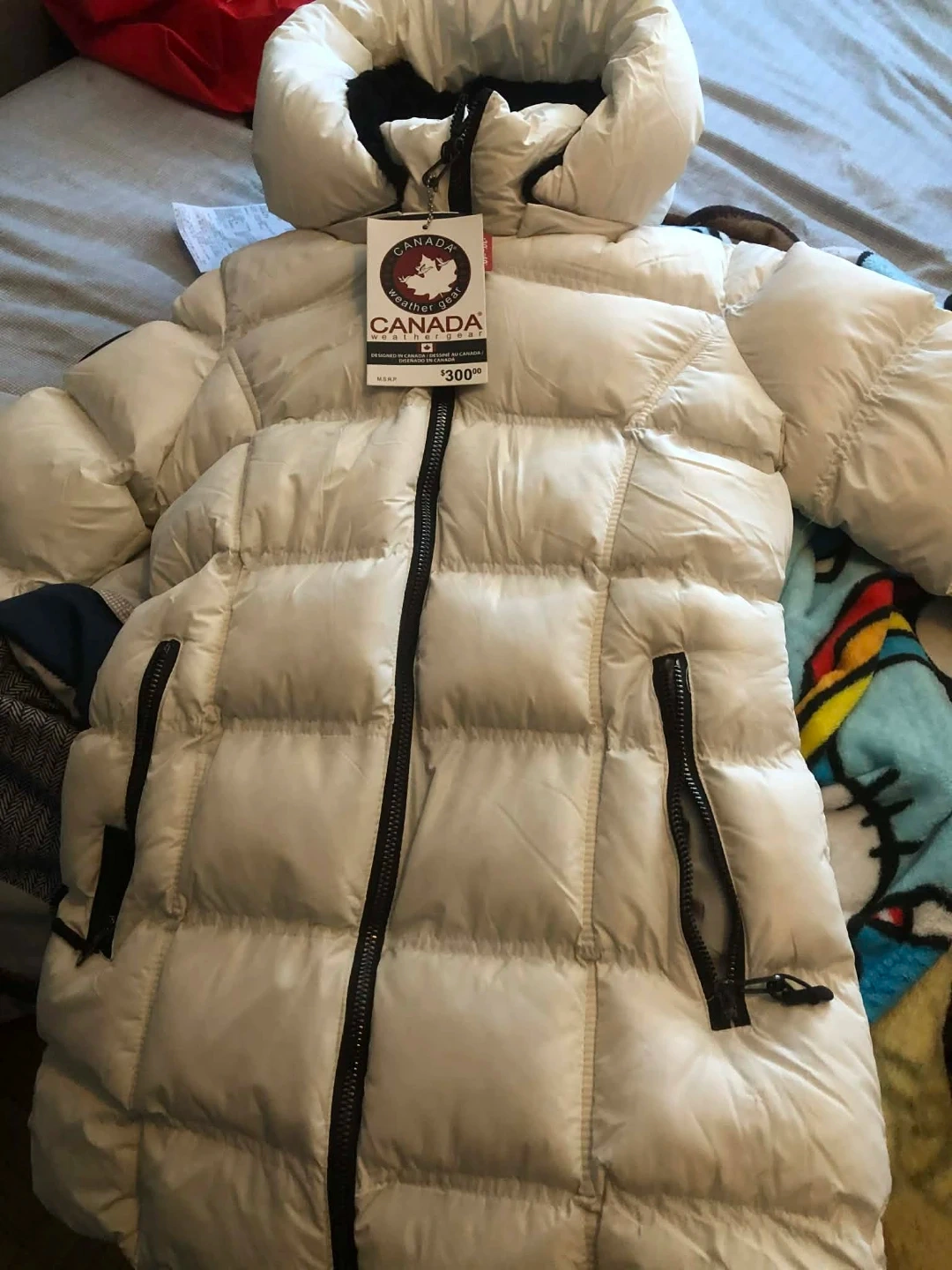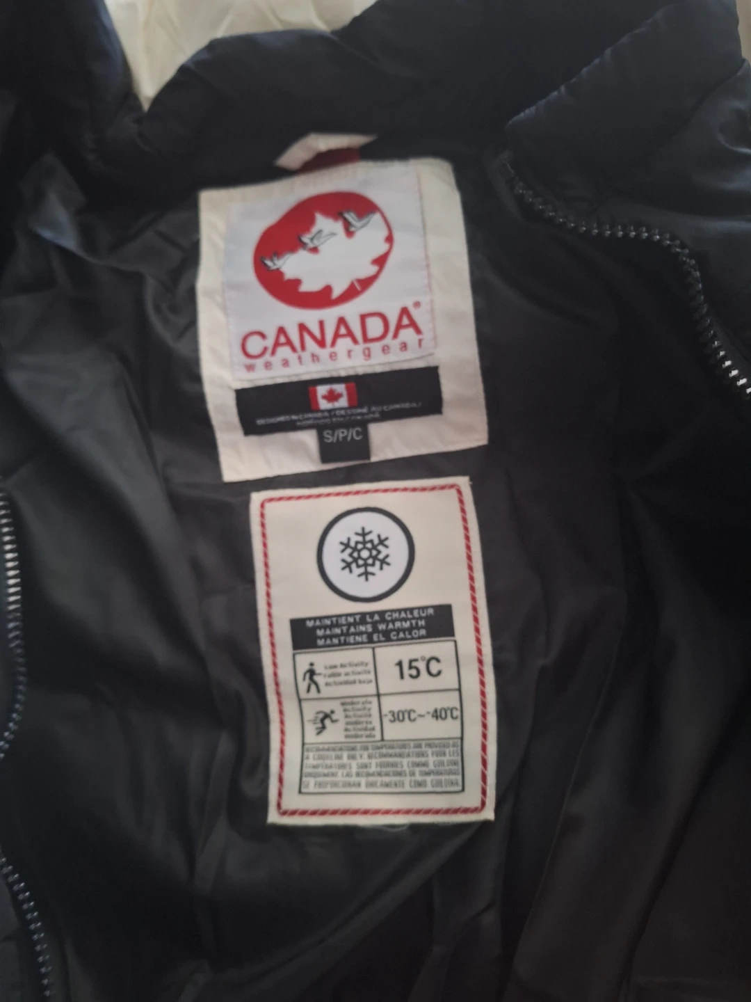 It's a white Canada Weather Gear puffer jacket. It's designed for cold weather, maintaining warmth down to -30°C to -40°C. Perfect for staying cozy during winter!