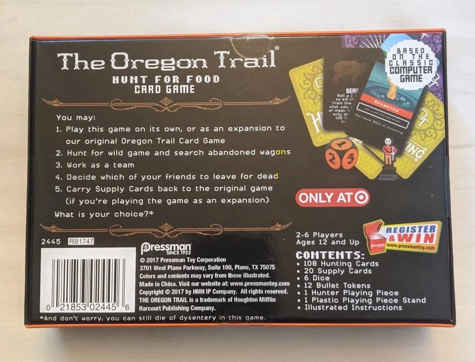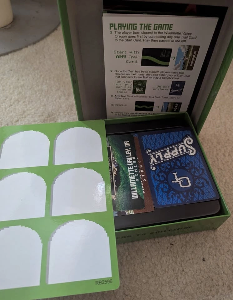 Complete Oregon Trail card game bundle. Includes the original Oregon Trail Card Game and the Hunt for Food expansion/standalone game. Both games are in very good condition and appear complete with all pieces, cards, dice, and instructions. Great for fans of the classic computer game or for family game nights. Slight crease in the hunting figure as shown in the picture.