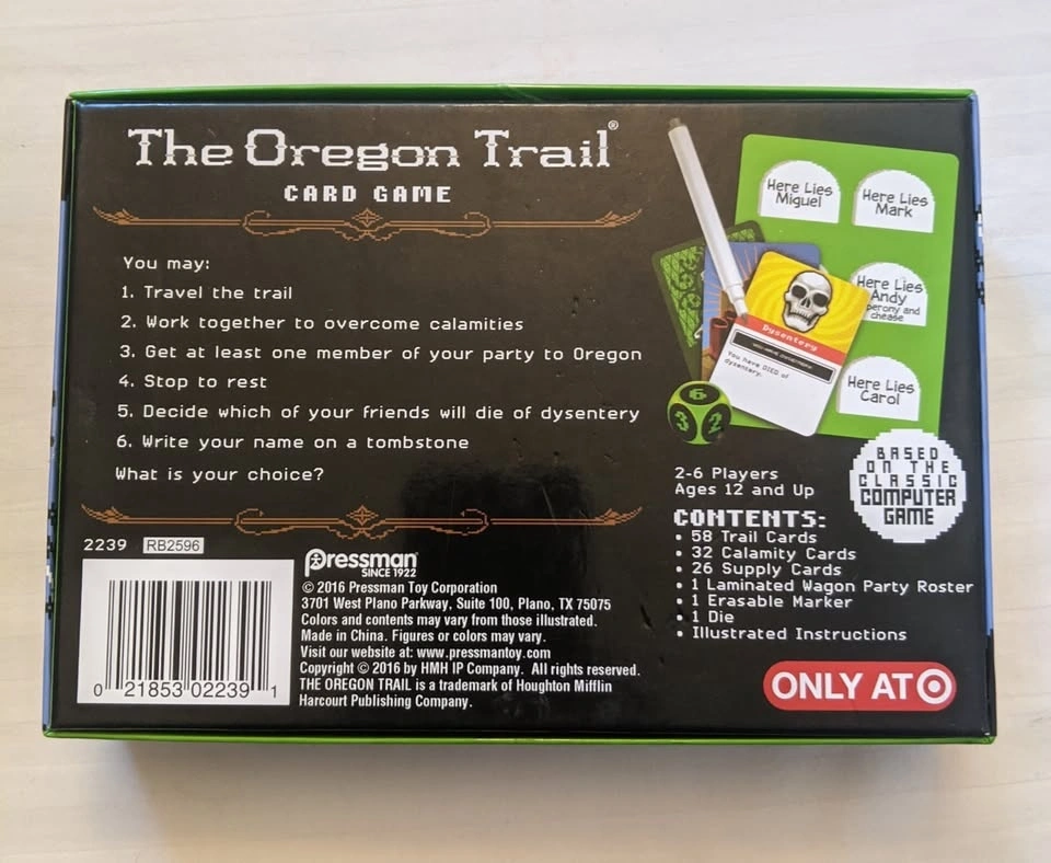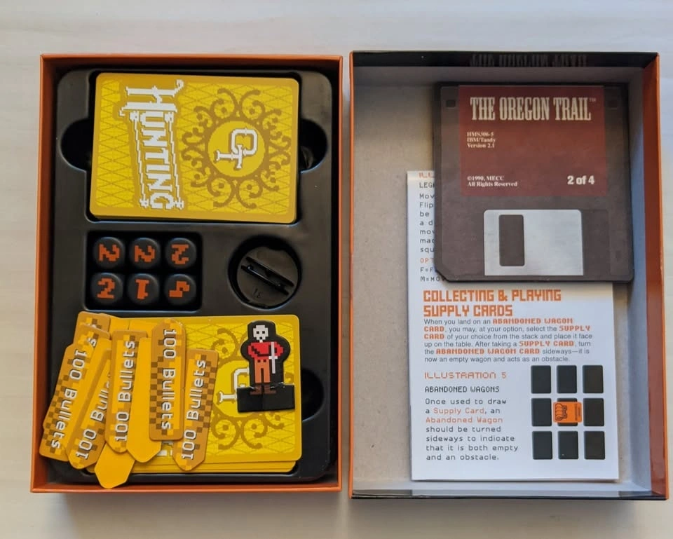 Complete Oregon Trail card game bundle. Includes the original Oregon Trail Card Game and the Hunt for Food expansion/standalone game. Both games are in very good condition and appear complete with all pieces, cards, dice, and instructions. Great for fans of the classic computer game or for family game nights. Slight crease in the hunting figure as shown in the picture.