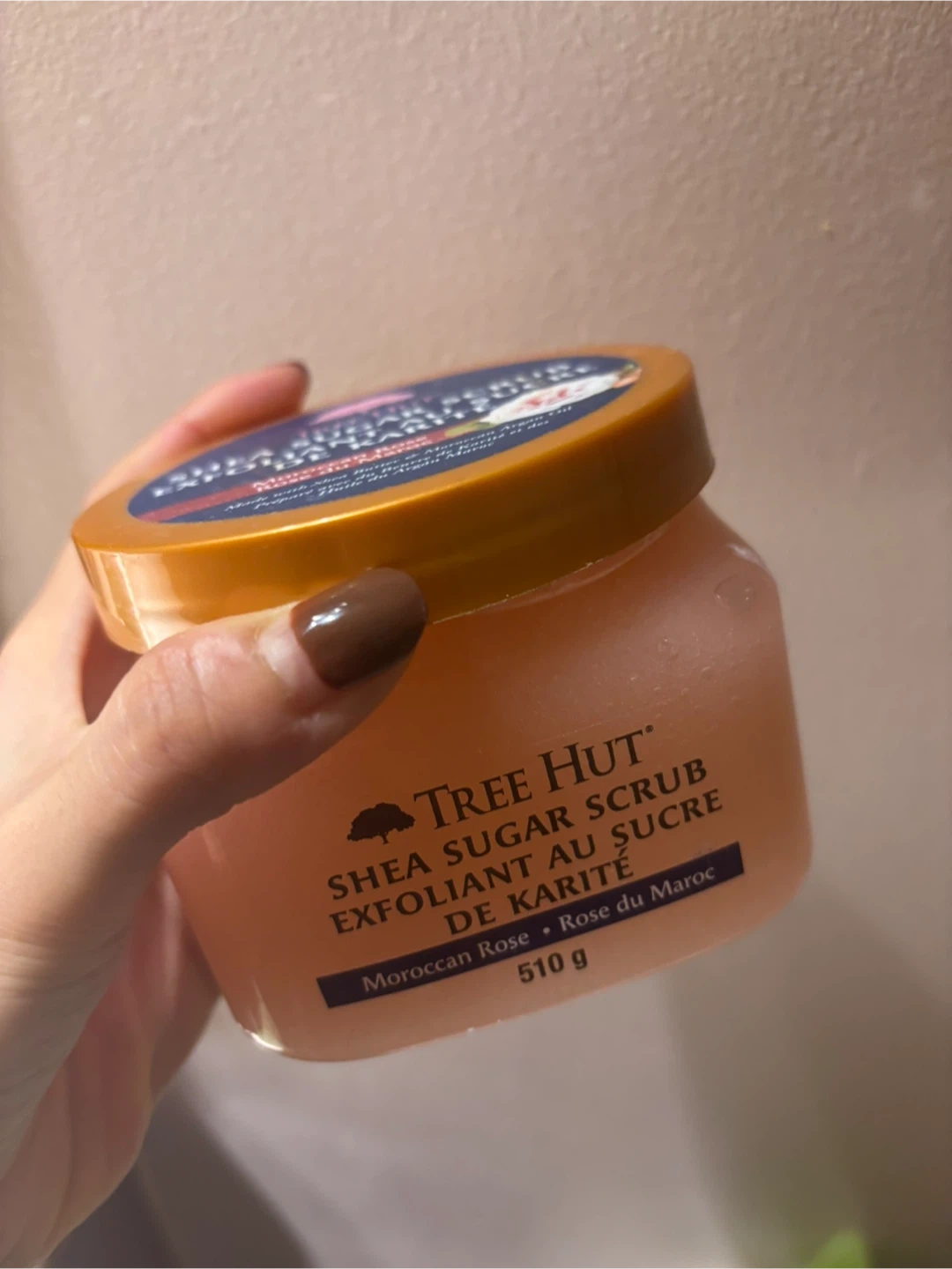 Tree Hut Shea Sugar Scrub in the Moroccan Rose scent. This exfoliant comes in a 510g jar. It's made with shea butter to help nourish skin. This scrub is great for smoothing skin texture!