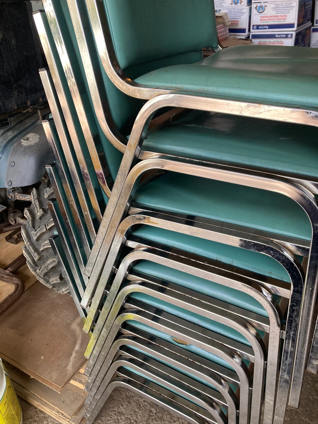 Selling a set of 9 stackable chairs with green padded seats and backs. They're perfect for extra seating when you have guests over or for events. They have chrome frames and are in good condition.