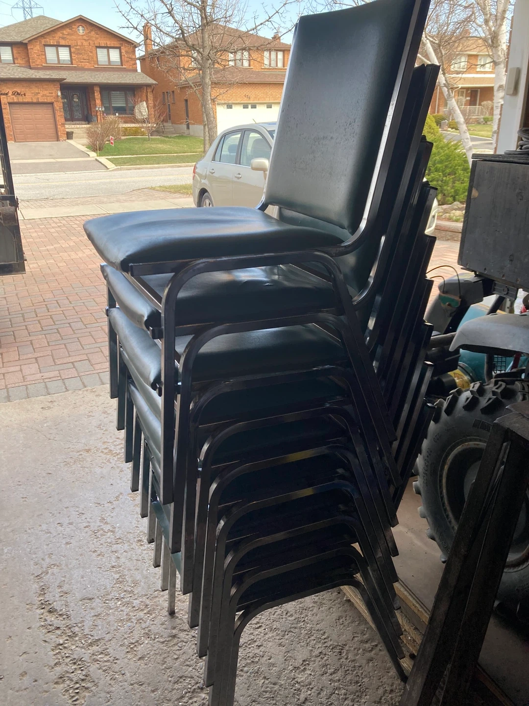 Set of 9 stackable chairs. Metal frame. Teal and black vinyl seats. Some wear and tear.