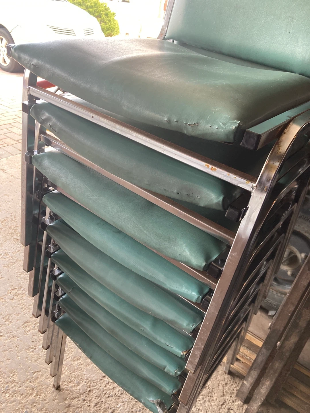 Selling a set of 9 stackable chairs with green padded seats and backs. They're perfect for extra seating when you have guests over or for events. They have chrome frames and are in good condition.