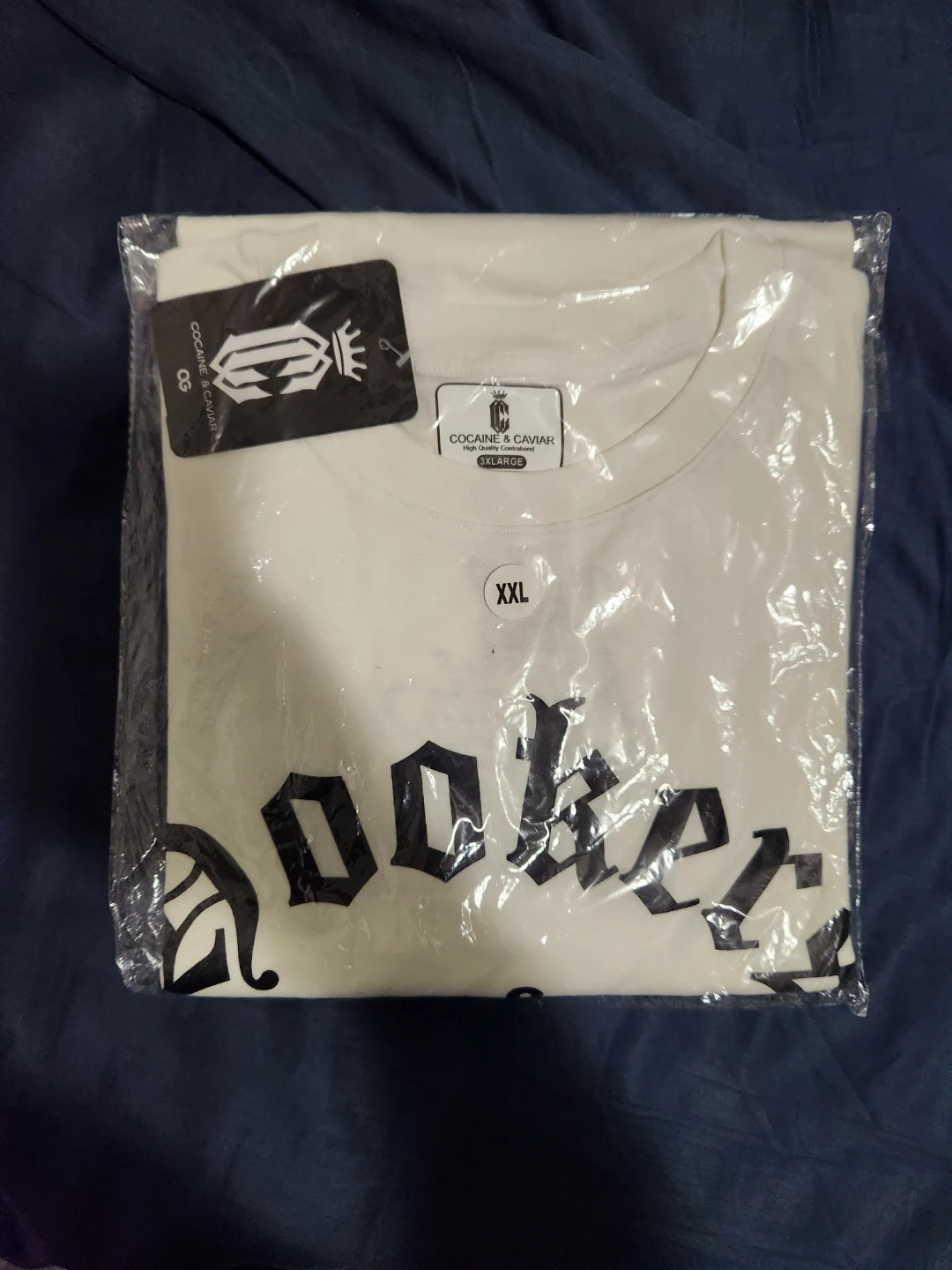 Brand new Cocaine & Caviar graphic t-shirt in cream. It's a size XXL. The shirt features a bold graphic print on the front and back. It's still in its original packaging.
