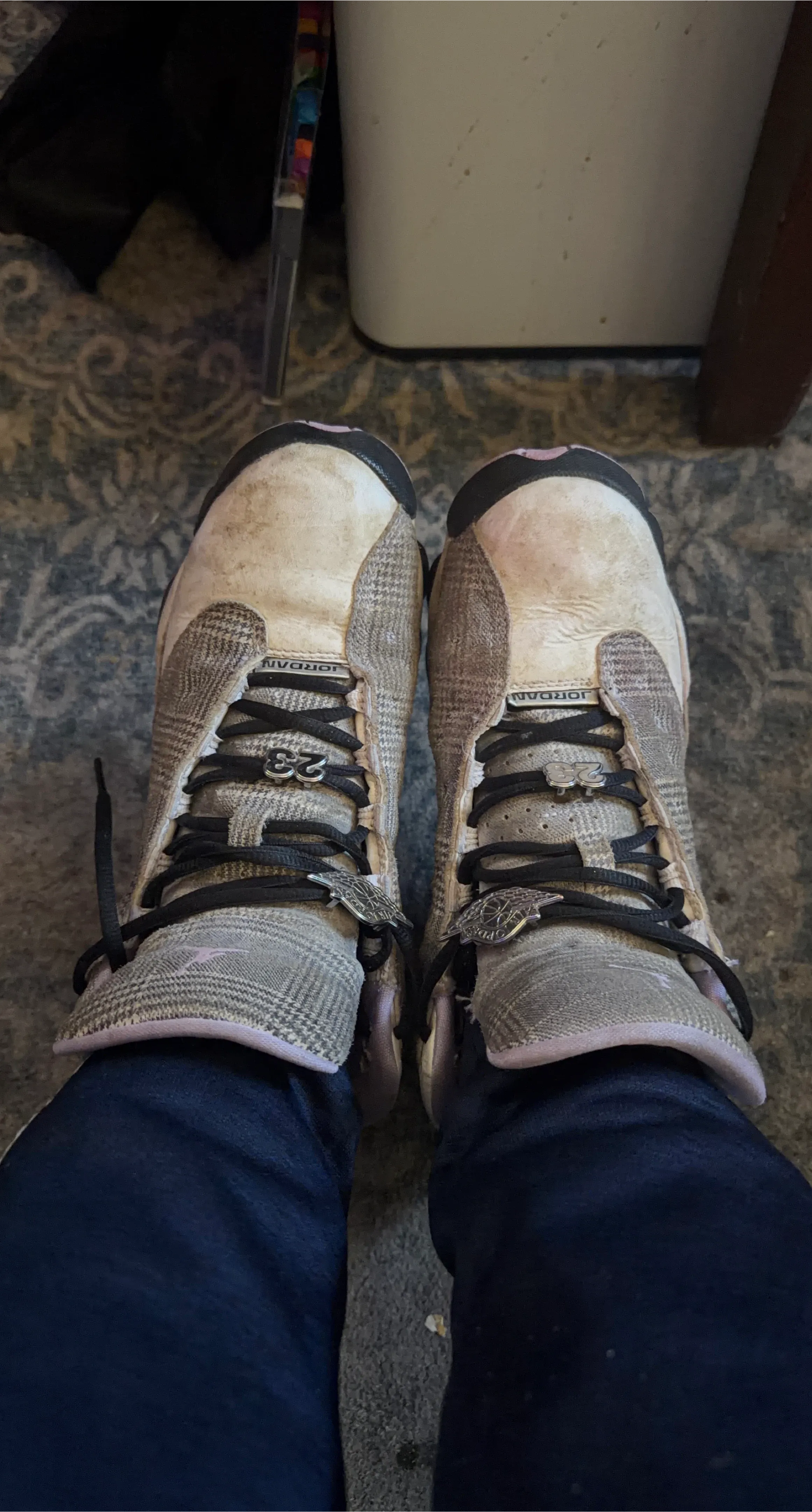 Air Jordan 13 Retro shoes with a unique plaid and leather upper. Features black laces and silver Jumpman branding. These are pre-owned. They are a 6 men’s. I wear a 8 woman’s and they fit me.