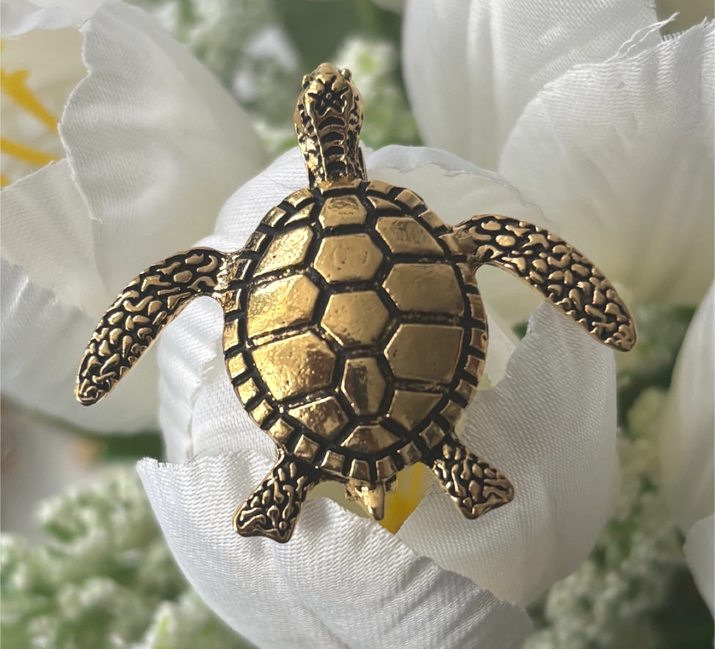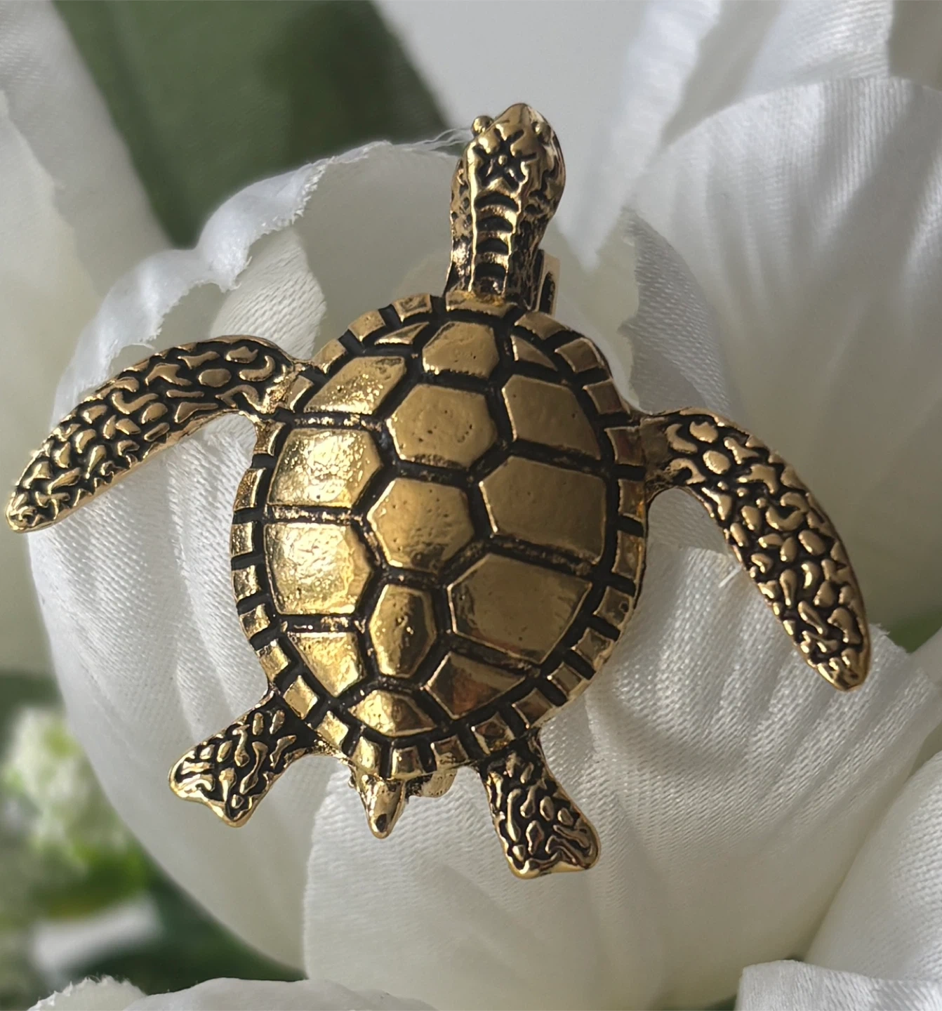 A cute gold tone turtle brooch pin. It's intricately detailed with a textured shell and flippers. The pin attaches securely to clothing or accessories.