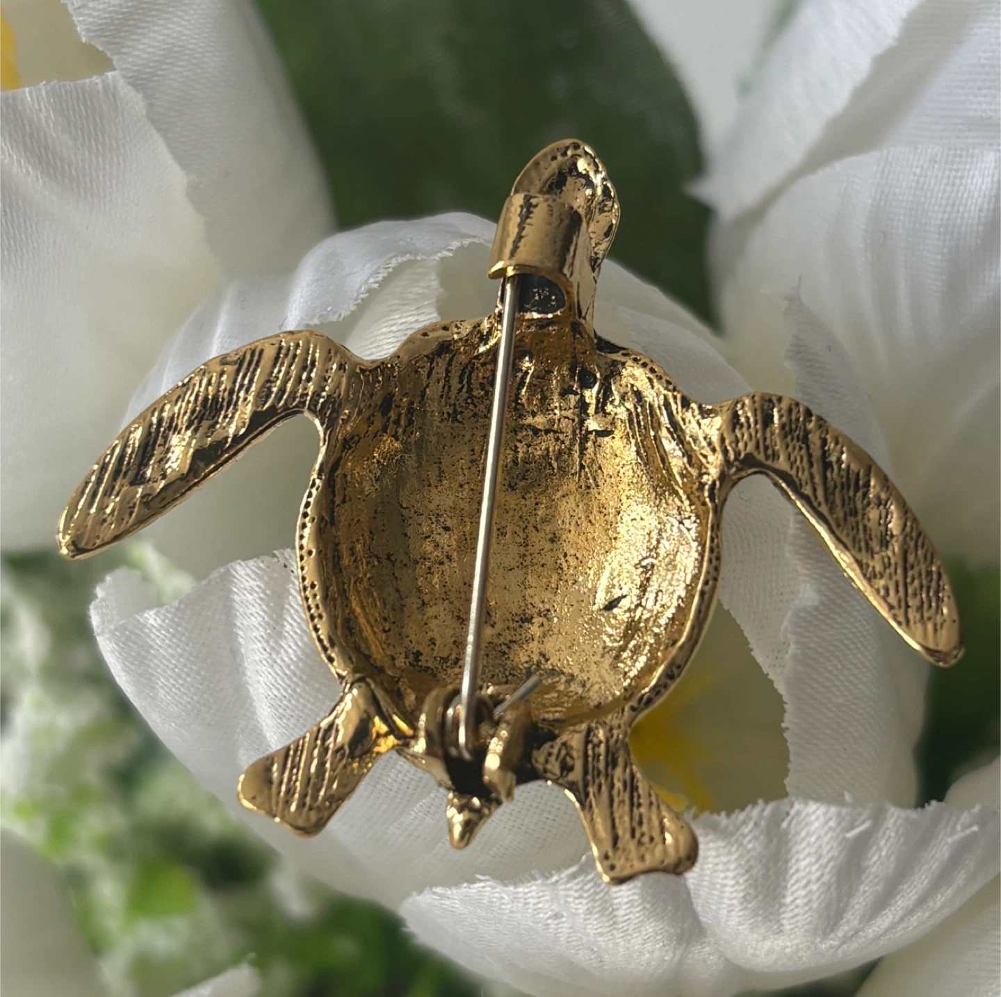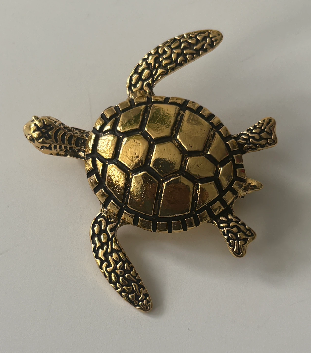 A cute gold tone turtle brooch pin. It's intricately detailed with a textured shell and flippers. The pin attaches securely to clothing or accessories.