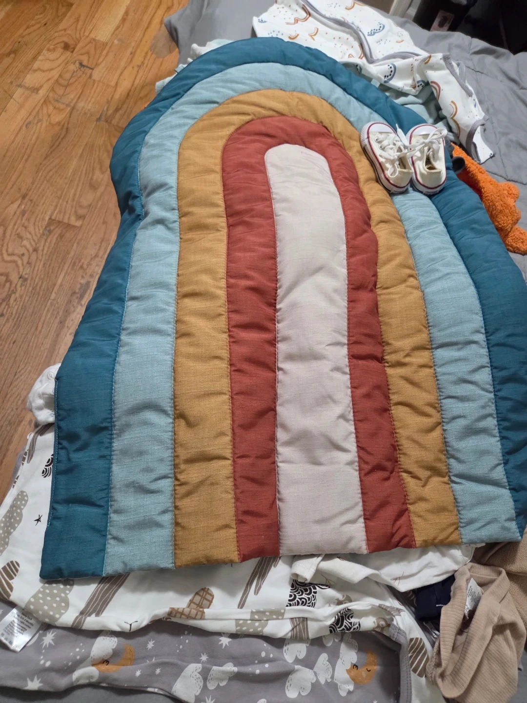 Ropita de bebé en buen estado y 3 saco para dormir estan nuevos talla del saco 0 6 meses tengo ropita de 0 a 9 meses y una cobija para poner en el suelo para bebes pequeños forma de arcoiris