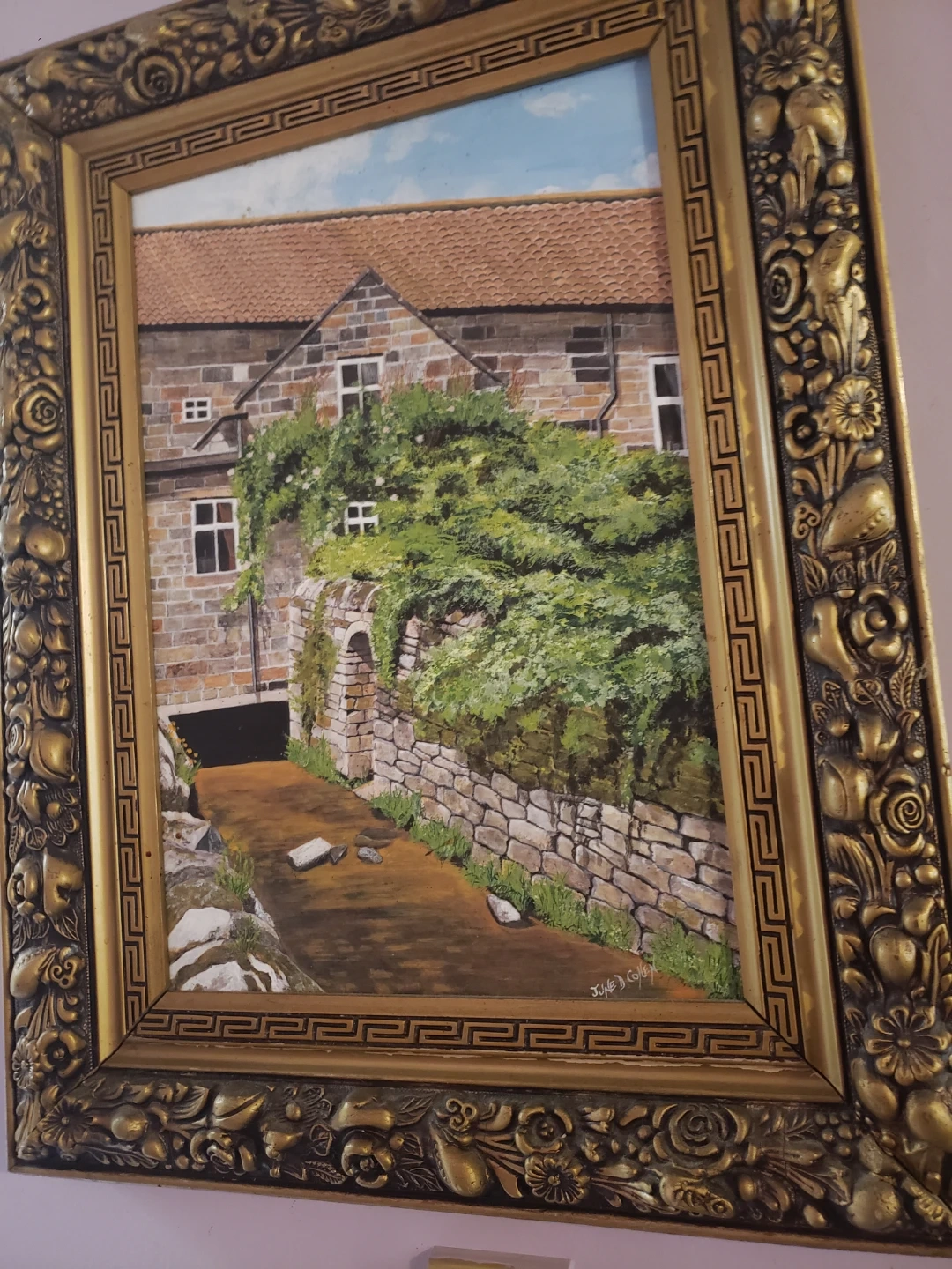 A framed painting depicts a quaint stone house covered in lush green vines. A small waterway flows alongside a stone wall, leading towards an arched opening. The artwork is housed in an ornate, textured gold frame.