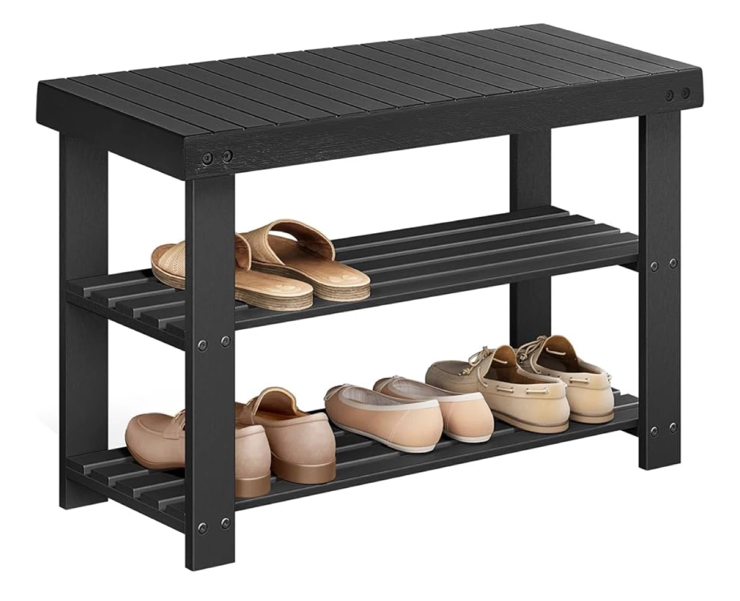 A 3-tier shoe rack bench. Its top holds up to 286 lb, and each shelf holds up to 22 lb. It's 27.6 inches long, 11.3 inches wide, and 17.8 inches tall. This bench is useful for storing shoes near an entryway.