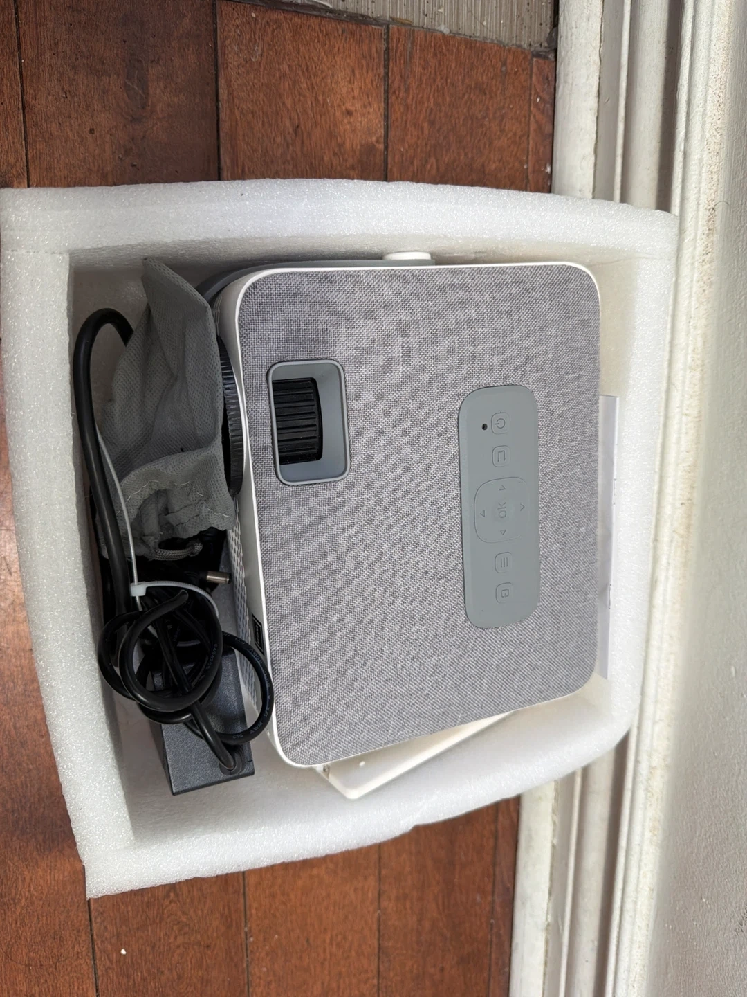Grey portable projector with fabric finish. Includes power adapter and cables. It's compact and easy to use for home entertainment.