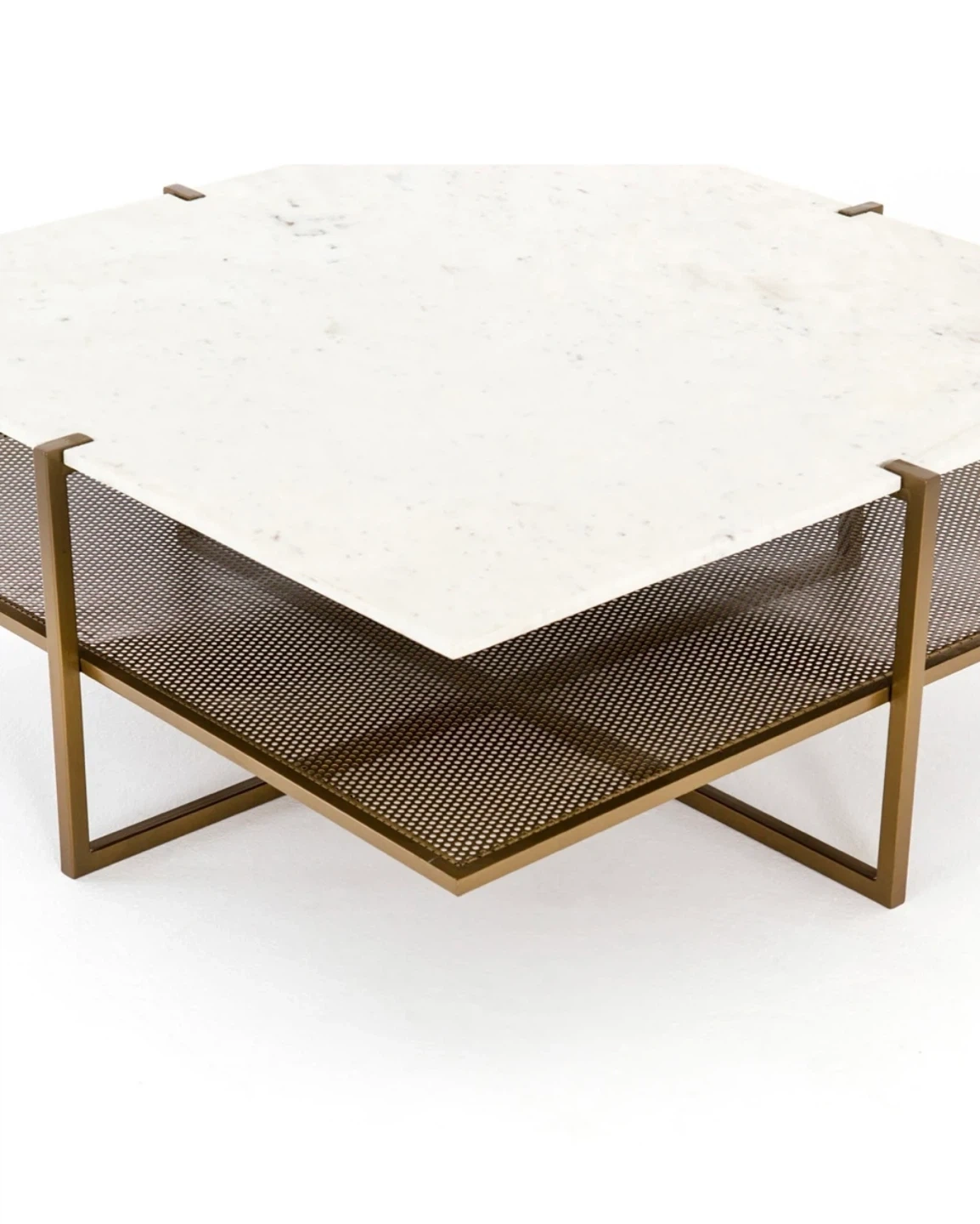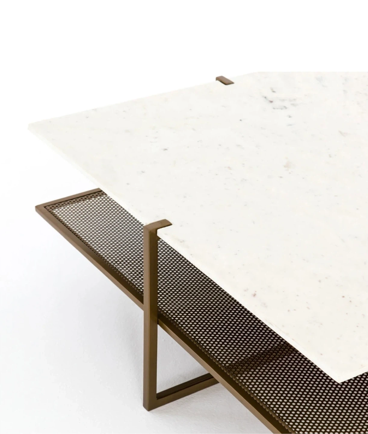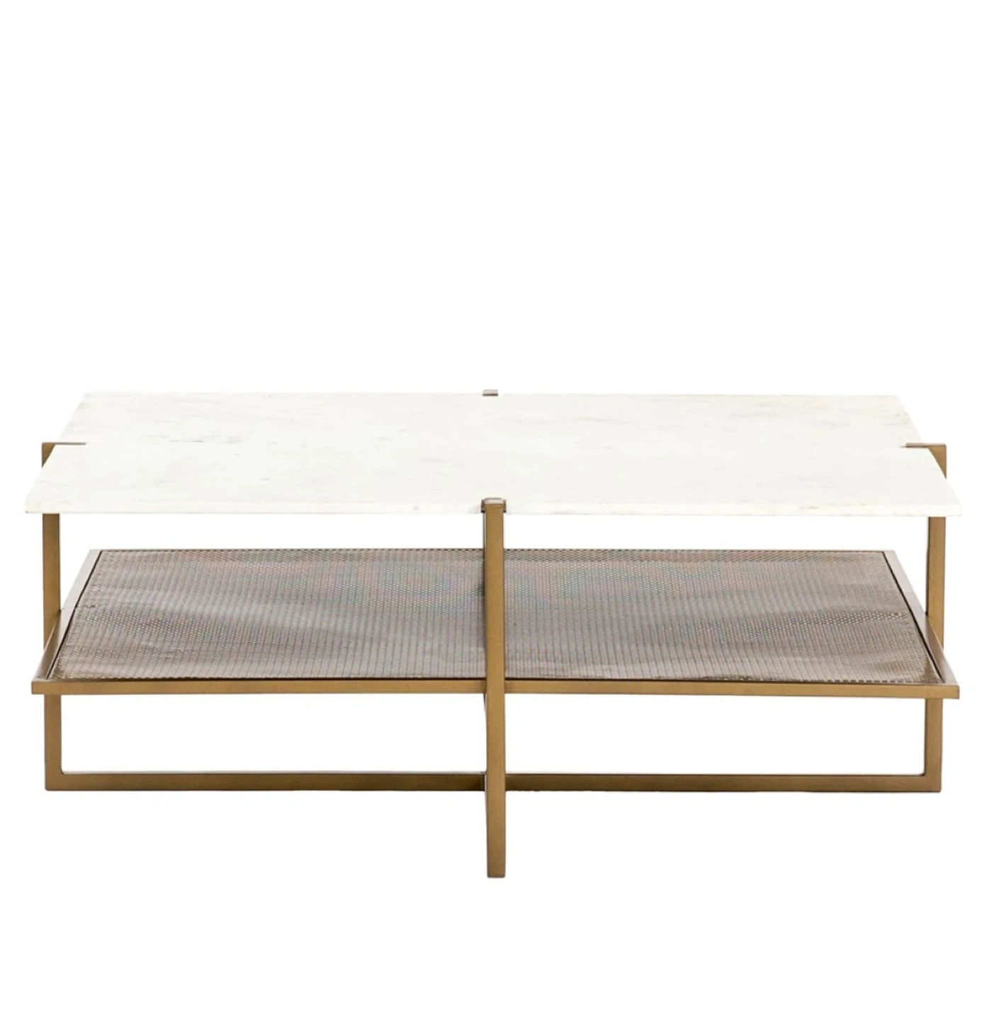 This coffee table features a white marble top and a bronze metal mesh shelf. It has a modern classic design with clean lines. It's a great centerpiece for any living room!