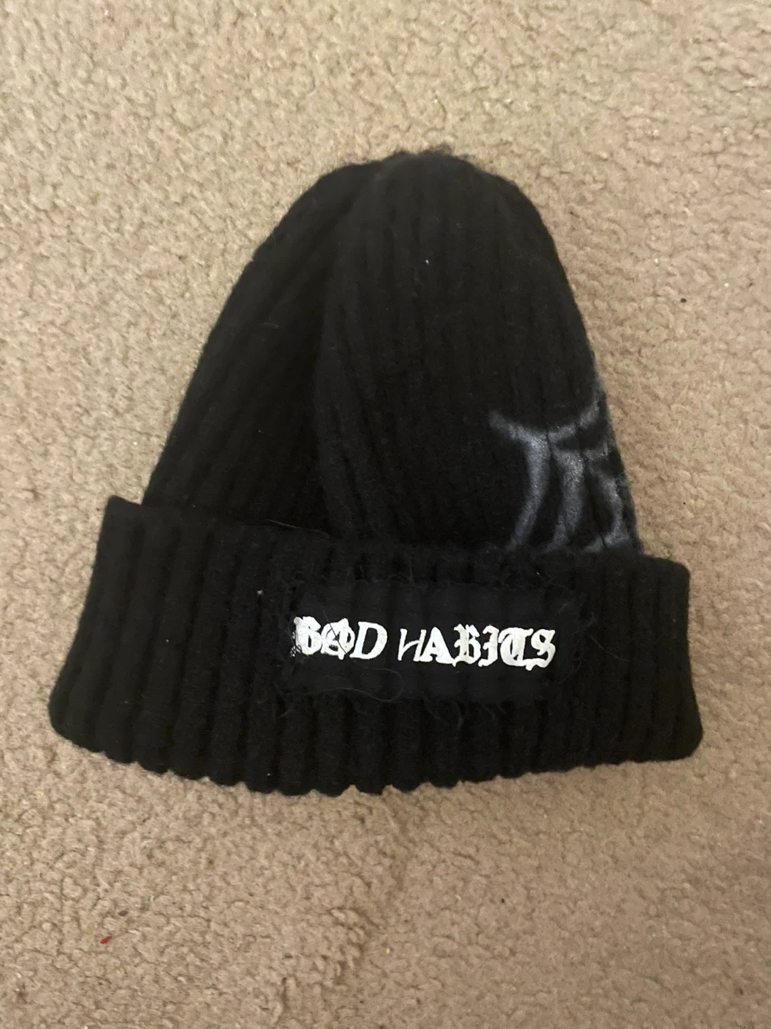 This black knit beanie features "Bad Habits" text on the front patch and a grey graphic design on the back. It's a ribbed knit style, perfect for cooler weather.