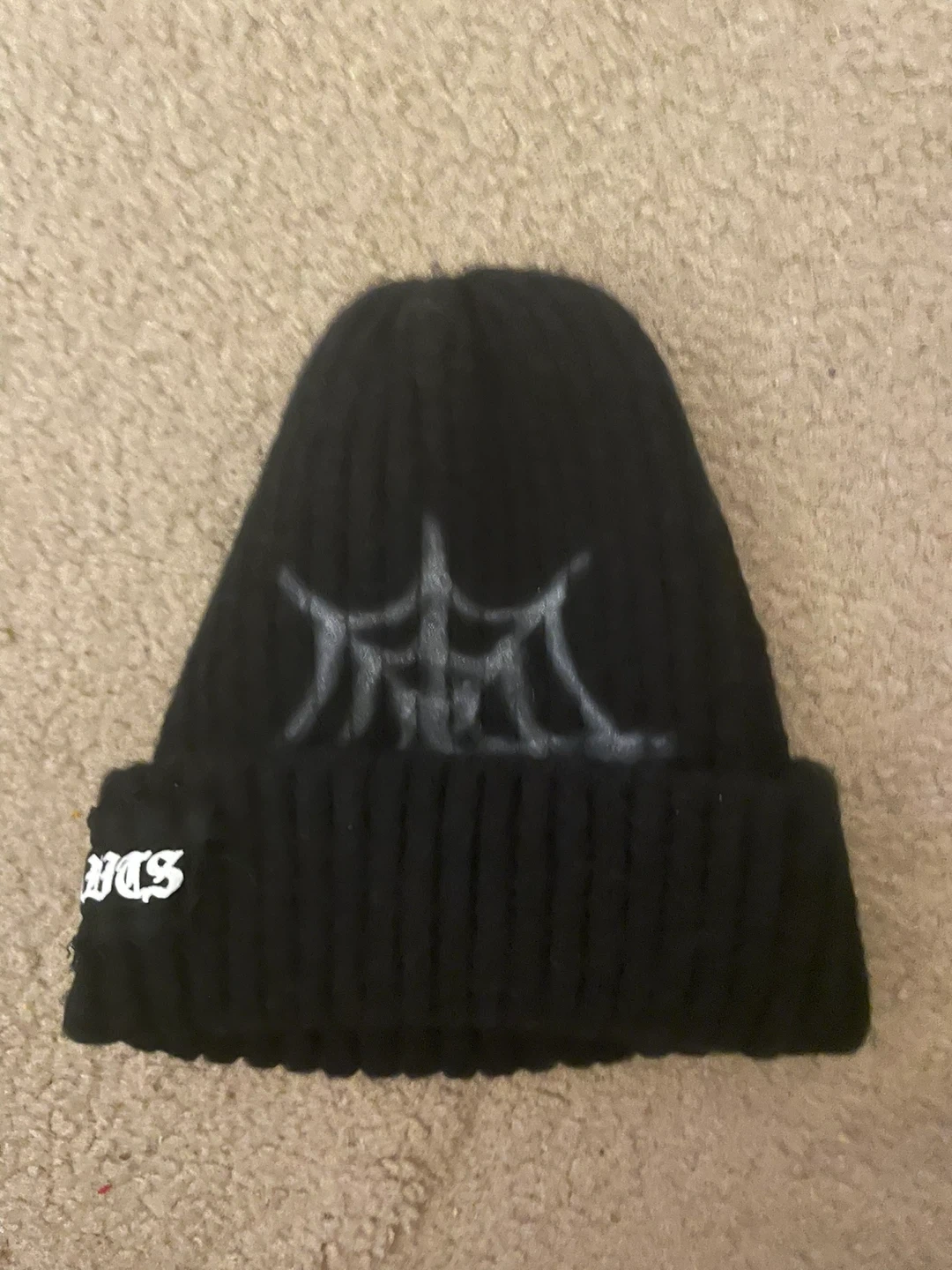 This black knit beanie features "Bad Habits" text on the front patch and a grey graphic design on the back. It's a ribbed knit style, perfect for cooler weather.
