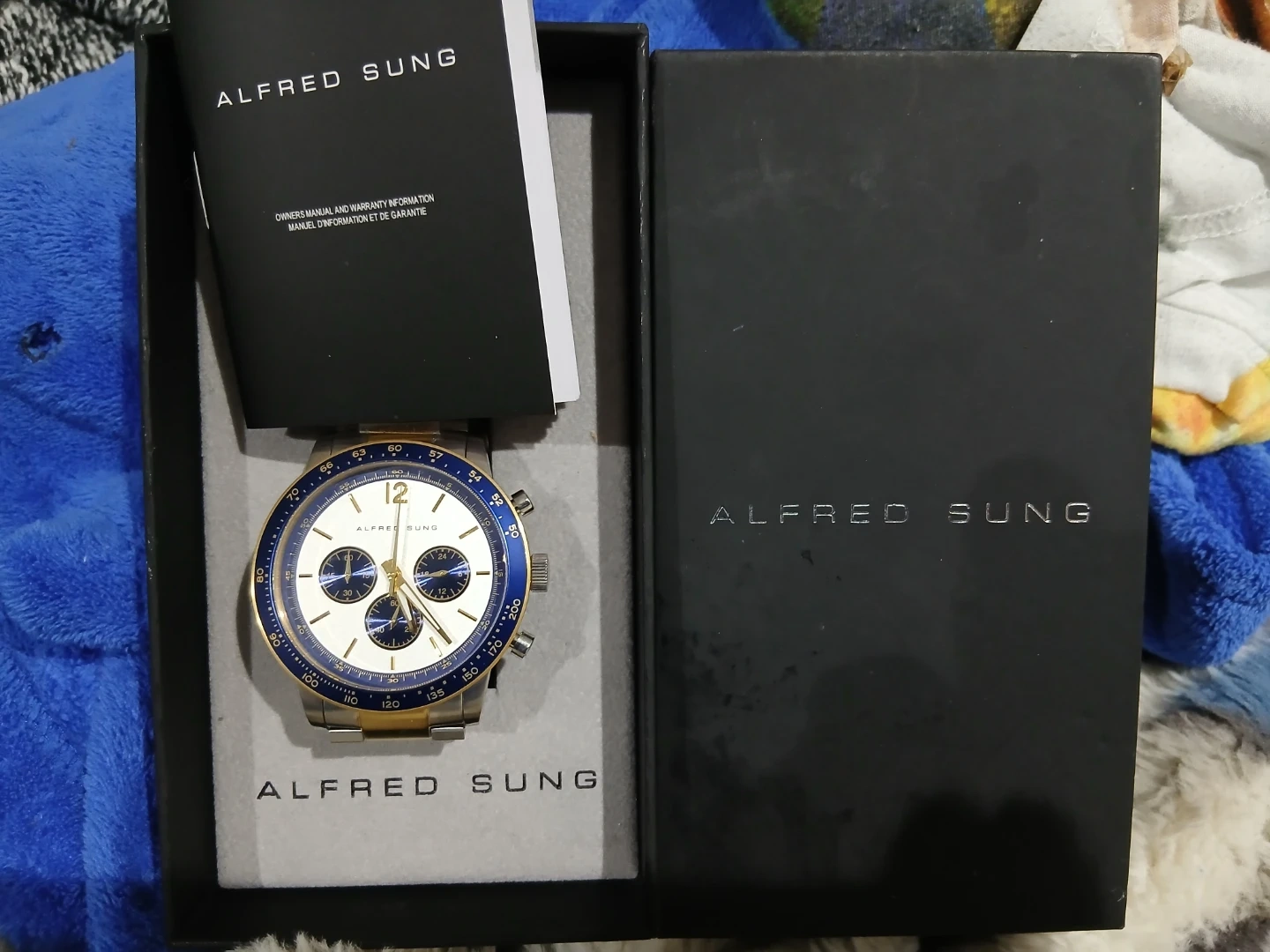 Alfred Sung chronograph watch with a white dial and blue accents on the bezel. It features a gold and silver tone metal band. Includes original box and owner's manual. Perfect for everyday wear!