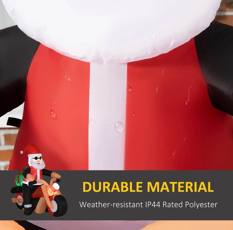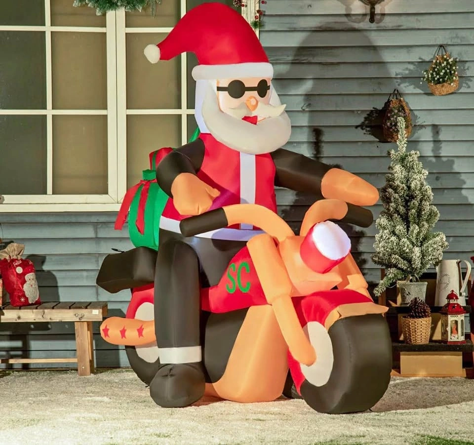 Brand new in box! 5.5' H Christmas holiday yard inflatable outdoor decoration. Features Santa Claus riding a motorcycle and lights up with LEDs.