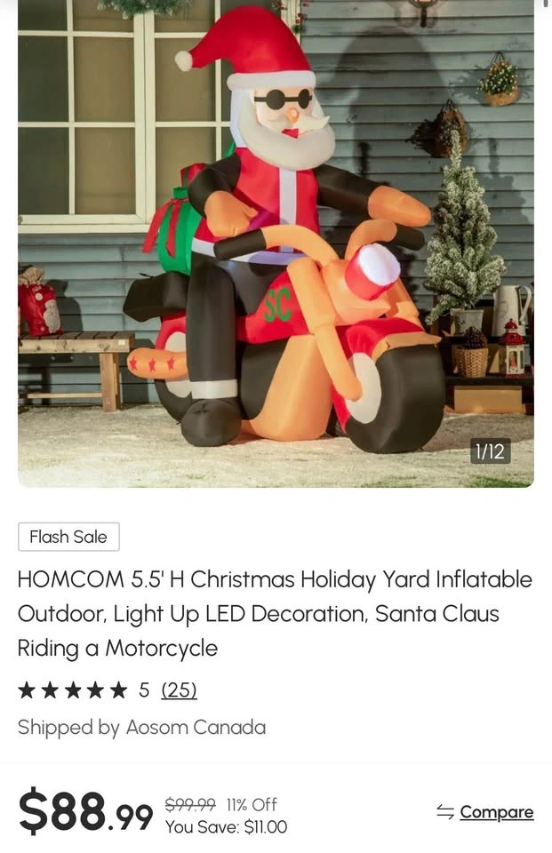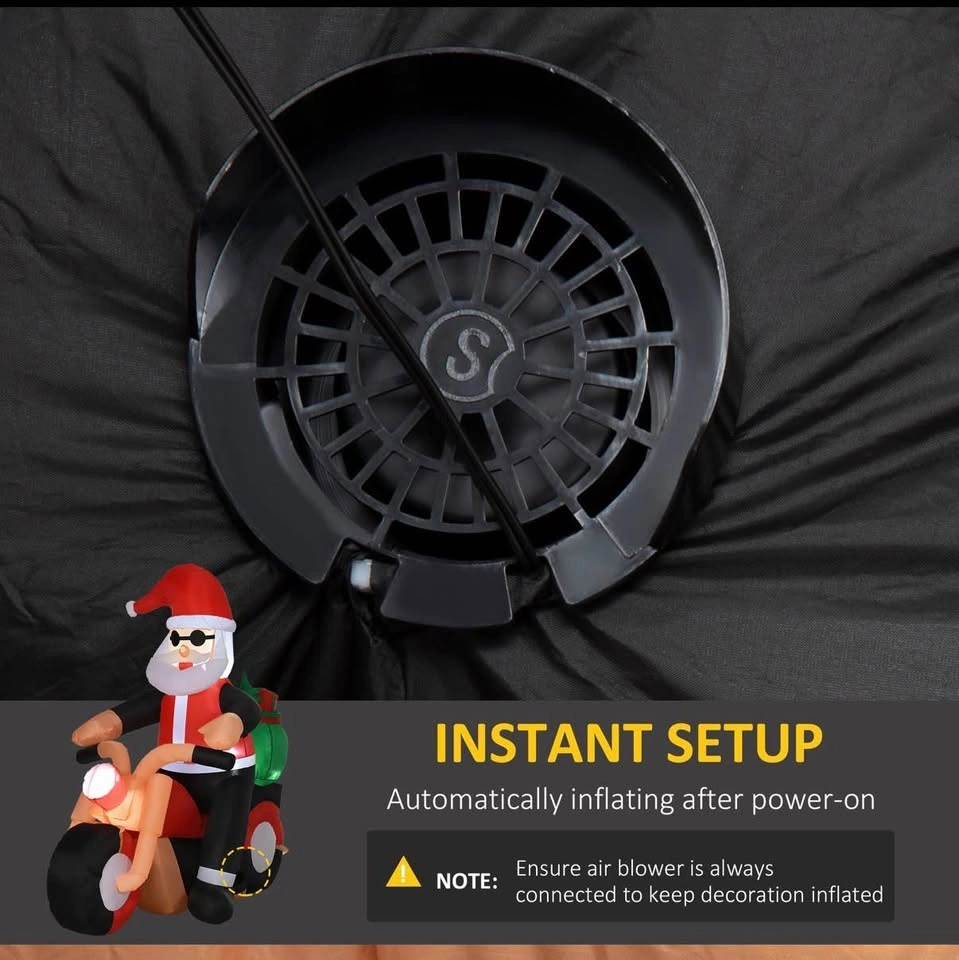 Brand new in box! 5.5' H Christmas holiday yard inflatable outdoor decoration. Features Santa Claus riding a motorcycle and lights up with LEDs.