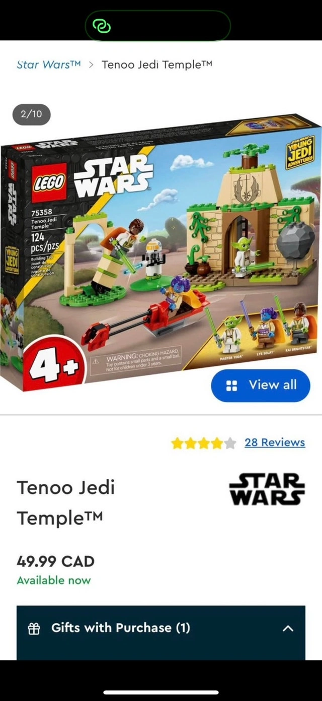 This new LEGO Star Wars set, Tenoo Jedi Temple 75358, contains 124 pieces for Young Jedi Adventures. Original price is $49.99 plus tax. Good for gift. Model number: 75358. 124 pieces. Ages 4+. From pet and smoke free home. Pick up at Creditview and Eglinton in Mississauga
