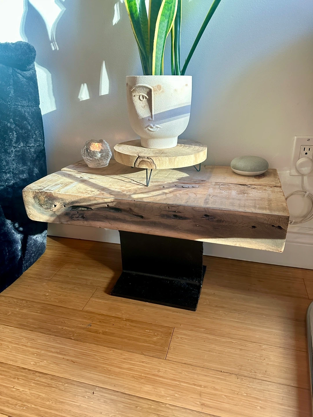 A custom made authentic i beam steel & reclaimed barn beam coffee end side accent night table. Beautiful grain character & honest markings on 100 yr. old pine wood.