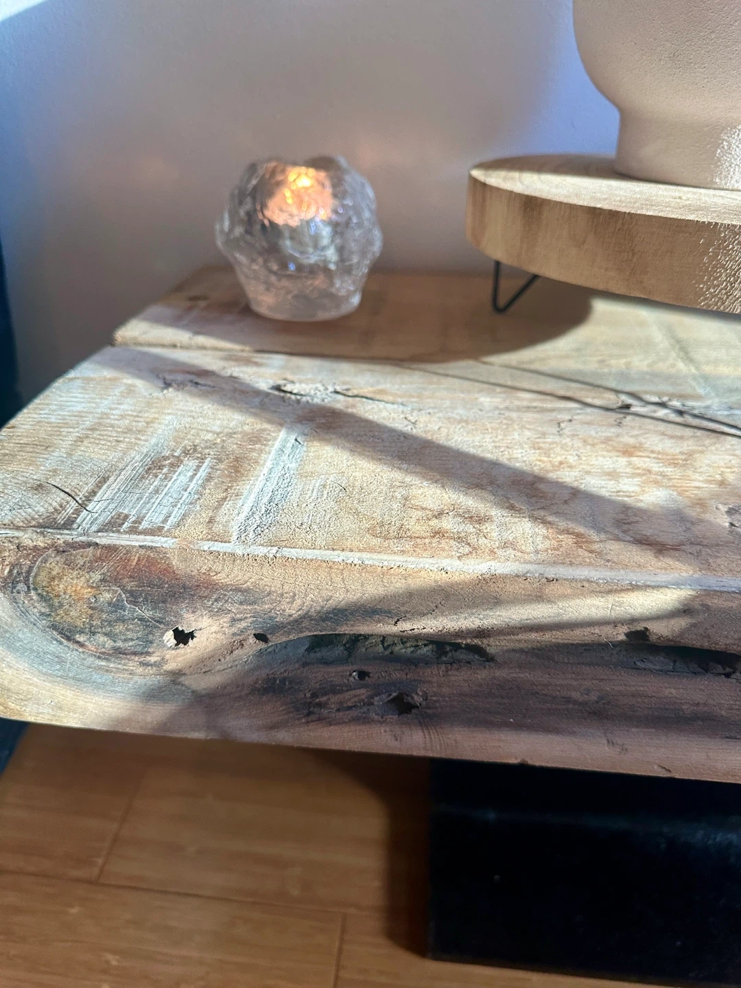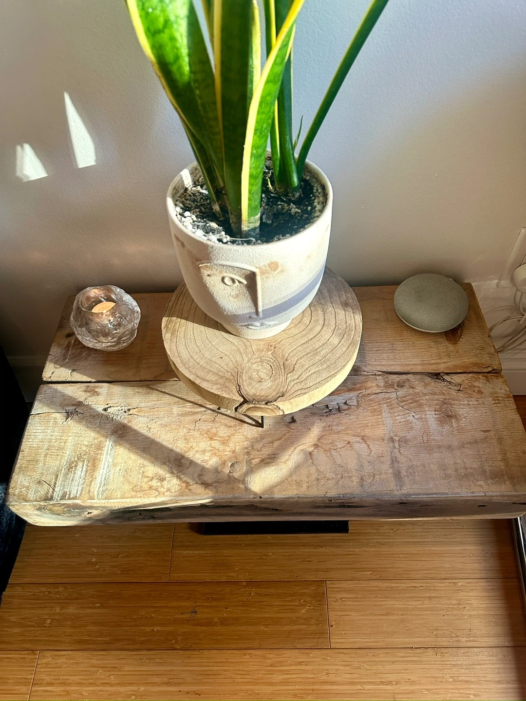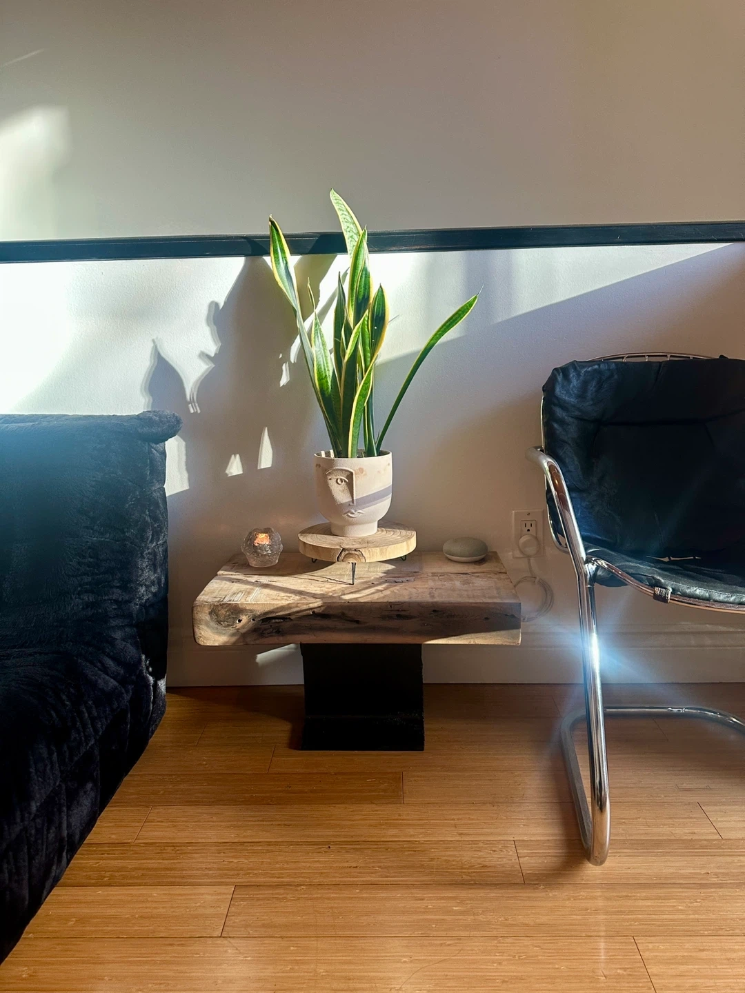 Boho chic wabi sabi interior design barn plant stand board pipe machine age industrial mid century modern farm house style display live edge salvaged home staging condo size cafe etc...