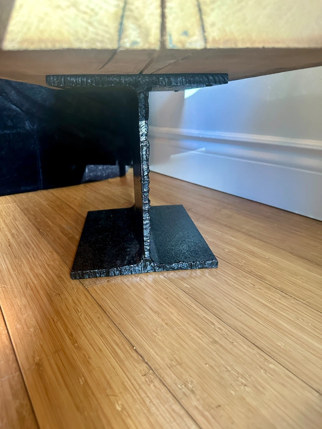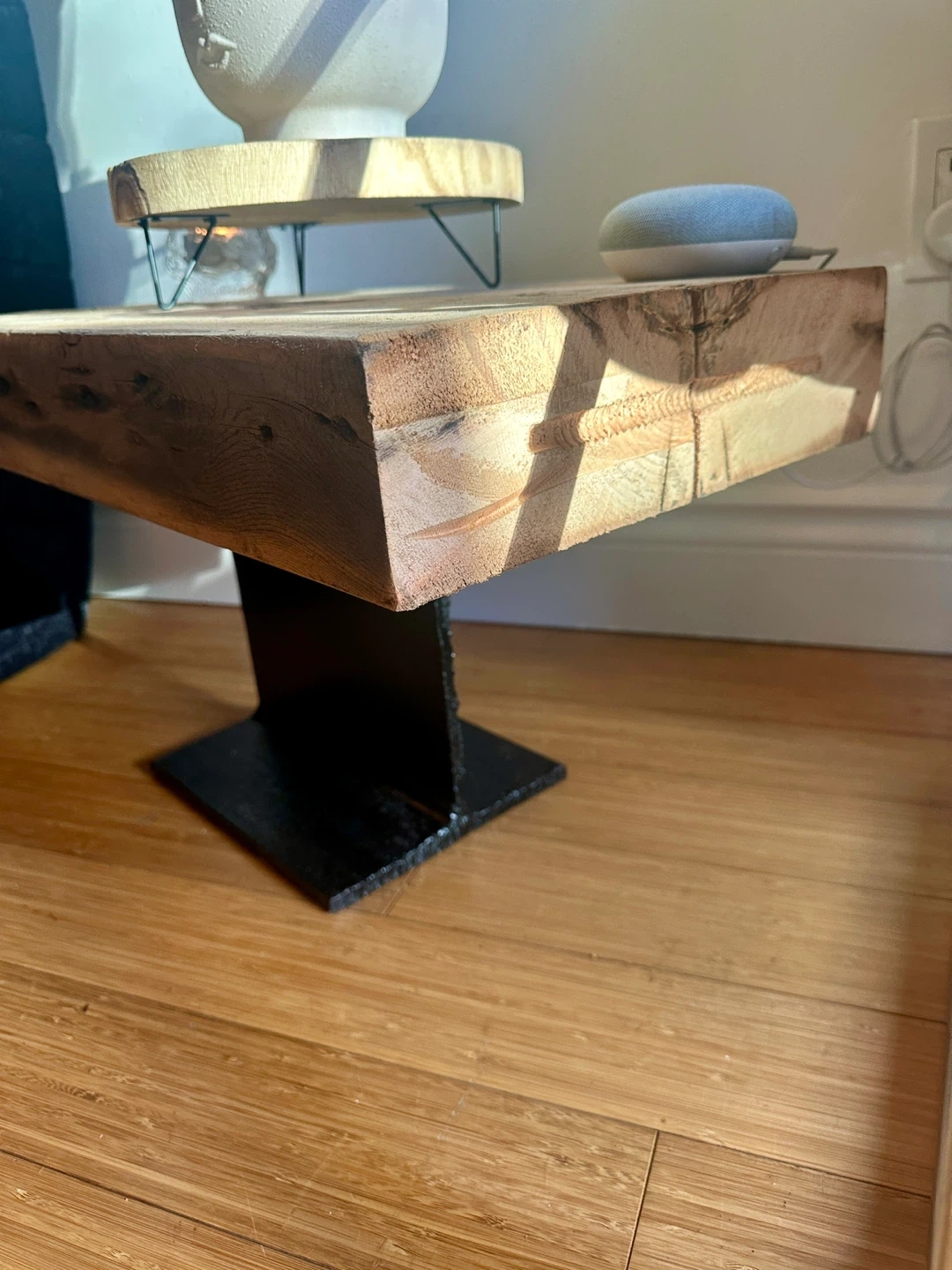 A custom made authentic i beam steel & reclaimed barn beam coffee end side accent night table. Beautiful grain character & honest markings on 100 yr. old pine wood.