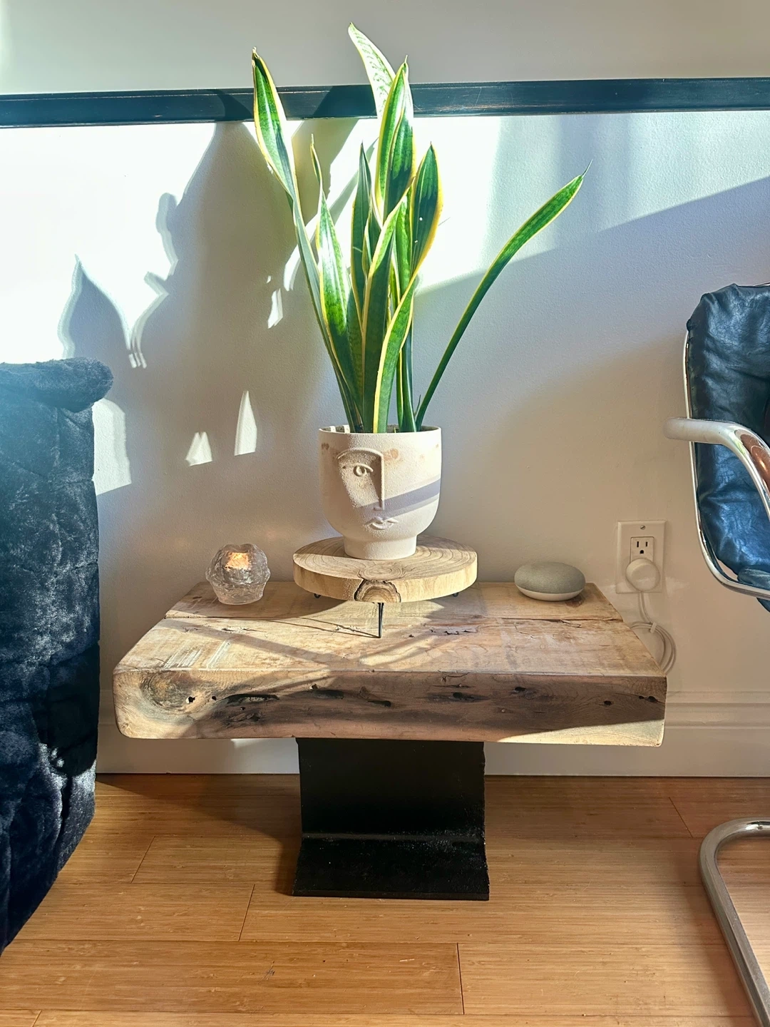 Boho chic wabi sabi interior design barn plant stand board pipe machine age industrial mid century modern farm house style display live edge salvaged home staging condo size cafe etc...