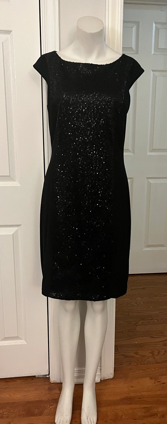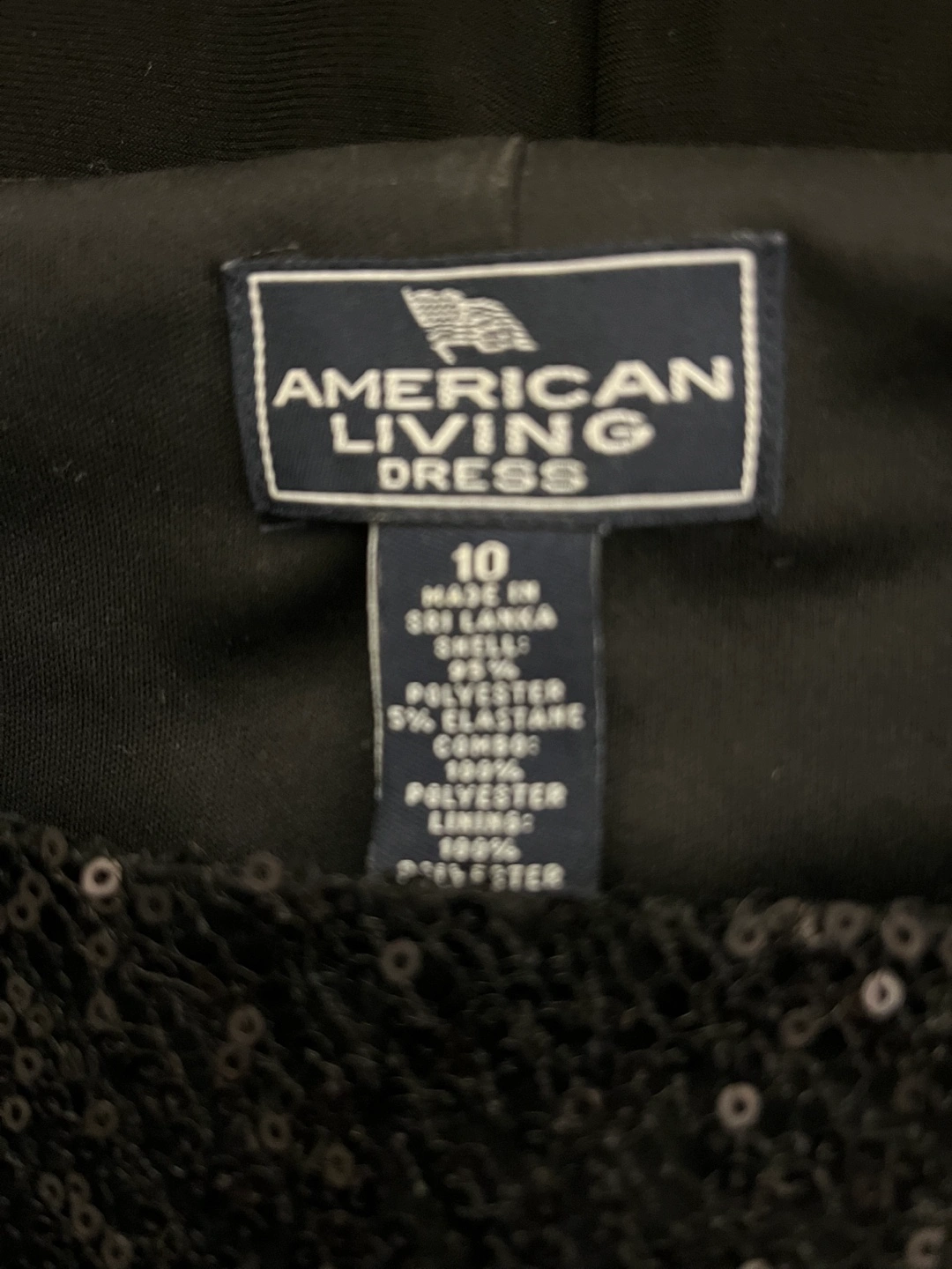 Sparkly black sequined dress from American Living. It's a size 10. Shell is 95% polyester and 5% elastane; lining is 100% polyester.