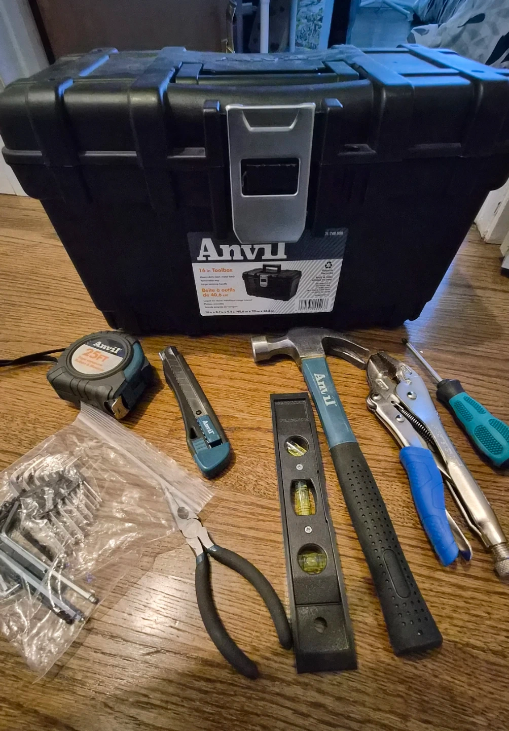 This Anvil toolbox comes packed with a variety of tools and hardware essentials. It includes a hammer, pliers, level, tape measure, utility knife, and assorted screws, anchors, and a wrench. Perfect for small projects and home repairs!