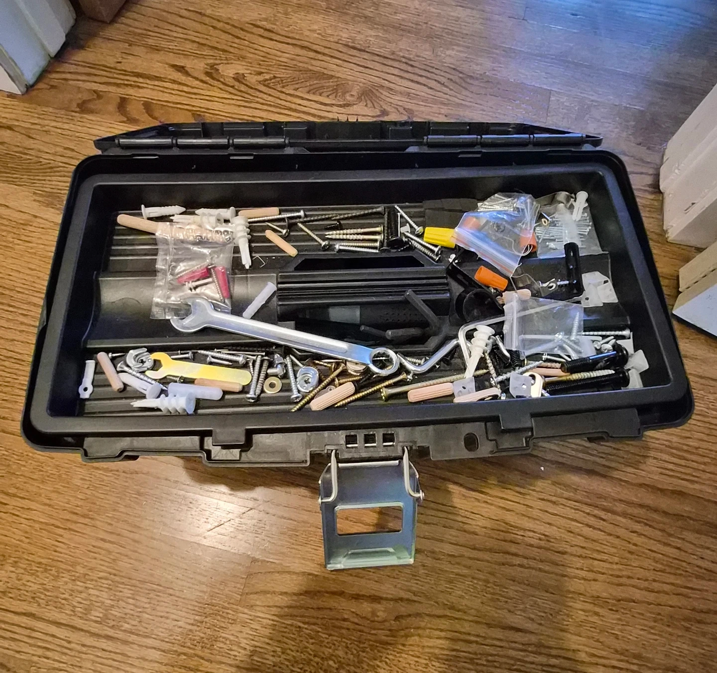 This Anvil toolbox comes packed with a variety of tools and hardware essentials. It includes a hammer, pliers, level, tape measure, utility knife, and assorted screws, anchors, and a wrench. Perfect for small projects and home repairs!