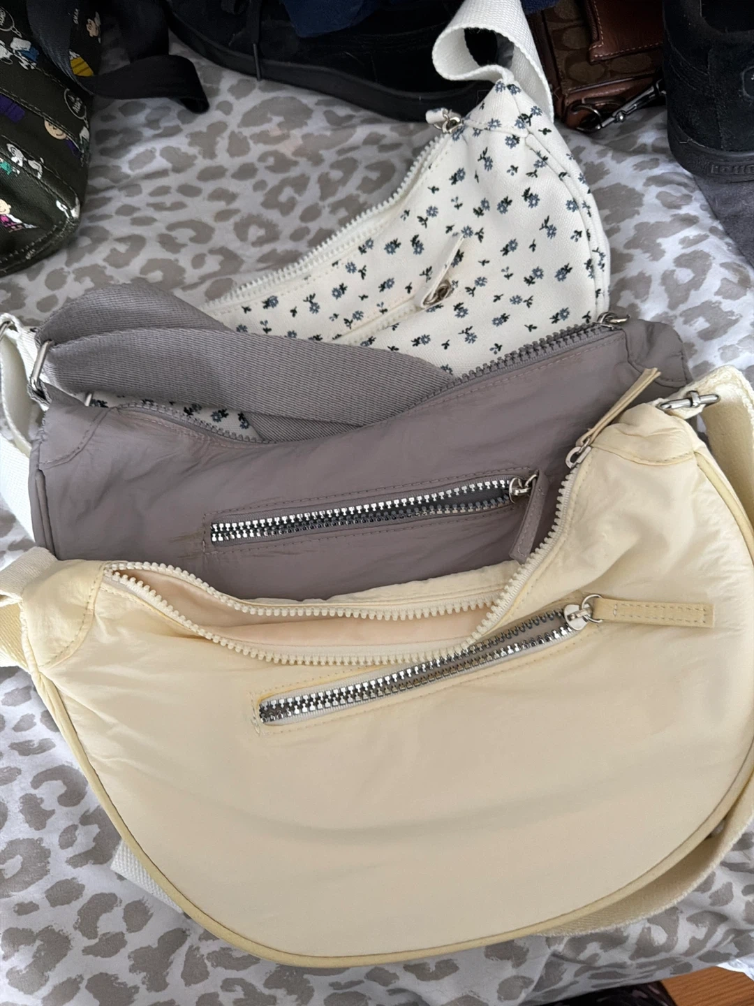 Selling three cute shoulder bags! One is white with a floral pattern, one is gray, and the other is a light yellow/cream color. Great for everyday use!