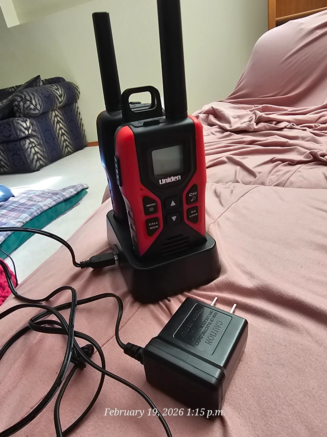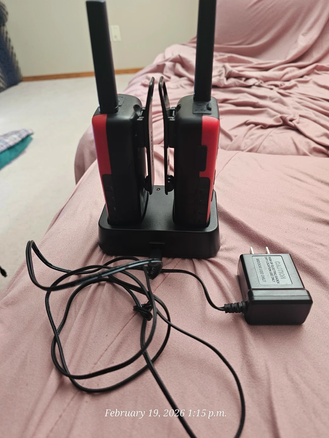 This is a twin pack of red and black Uniden walkie talkies, perfect for keeping in touch during outdoor adventures or around the house. They come with a charging base and AC adapter. Includes two walkie talkies.