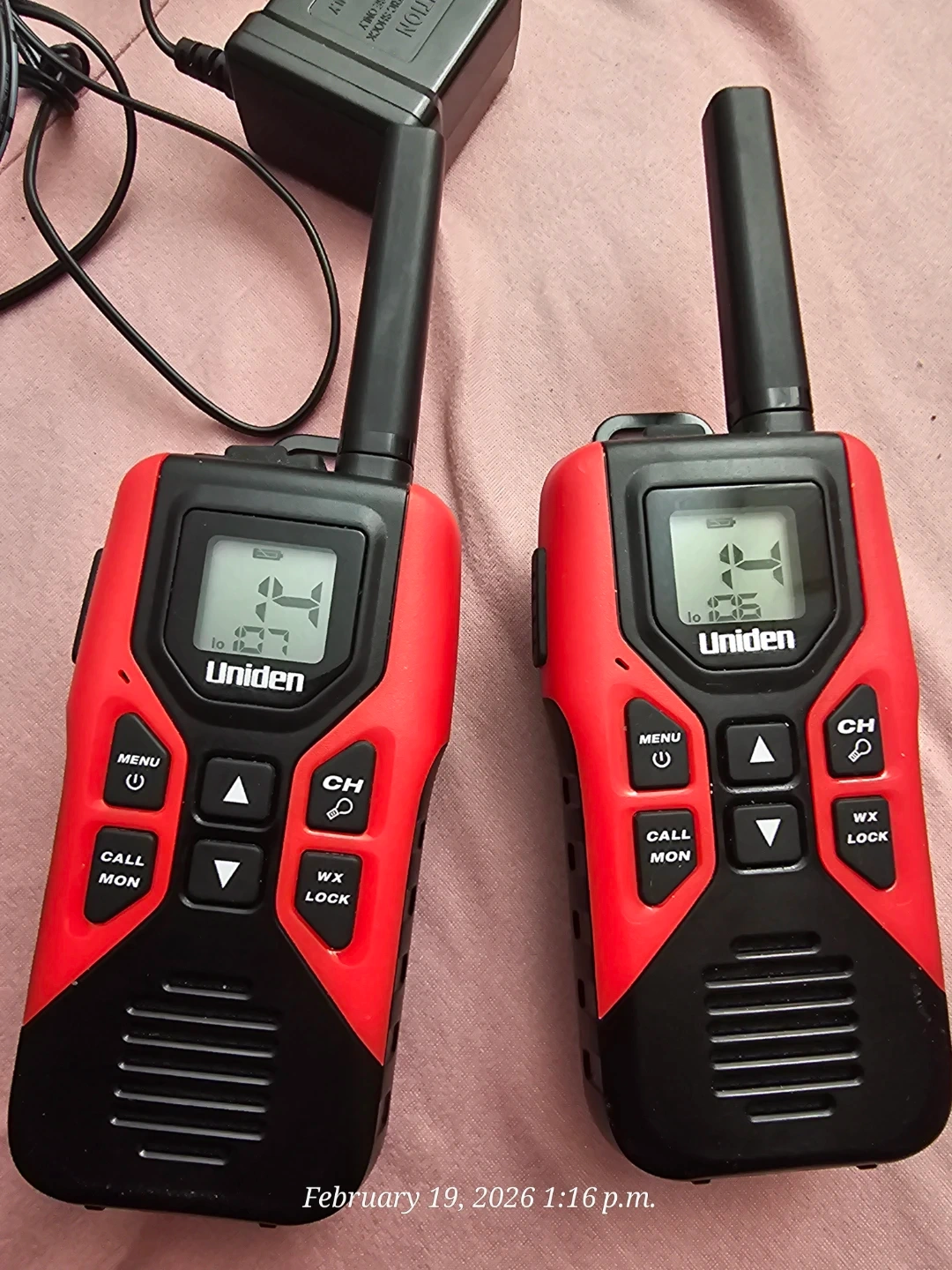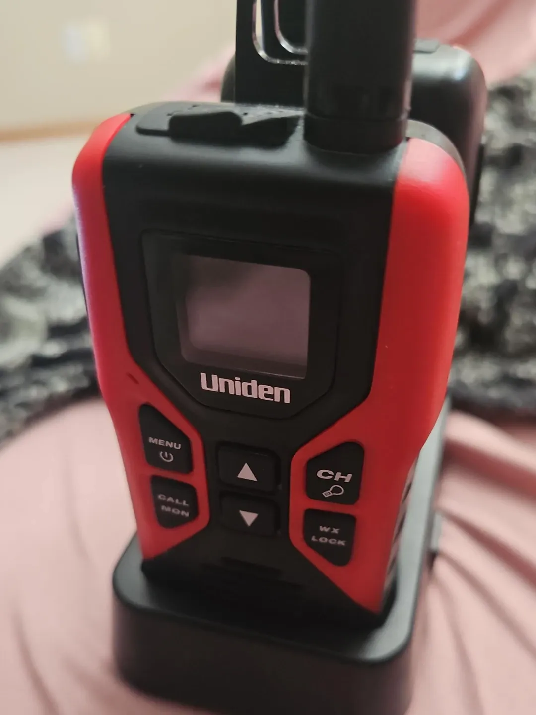This is a twin pack of red and black Uniden walkie talkies, perfect for keeping in touch during outdoor adventures or around the house. They come with a charging base and AC adapter. Includes two walkie talkies.