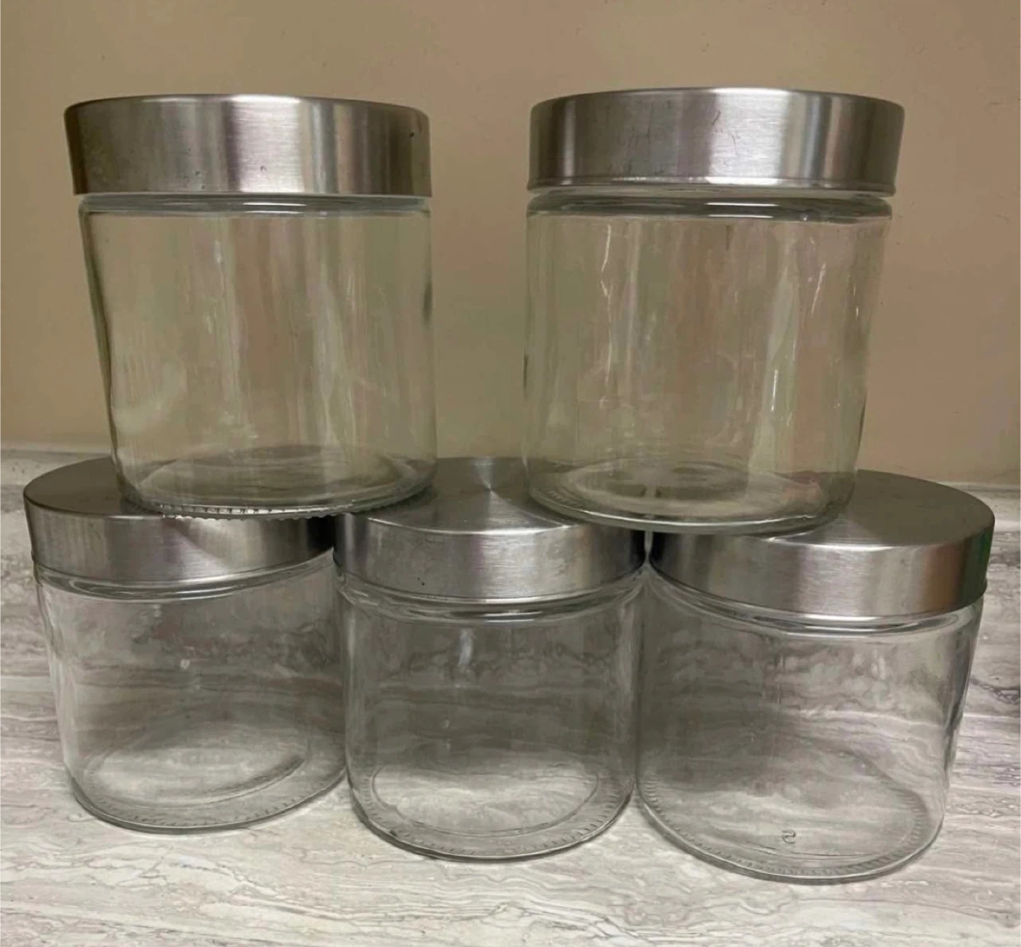 Set of 5 Large Clear Glass Jars with Silver Metal Lids