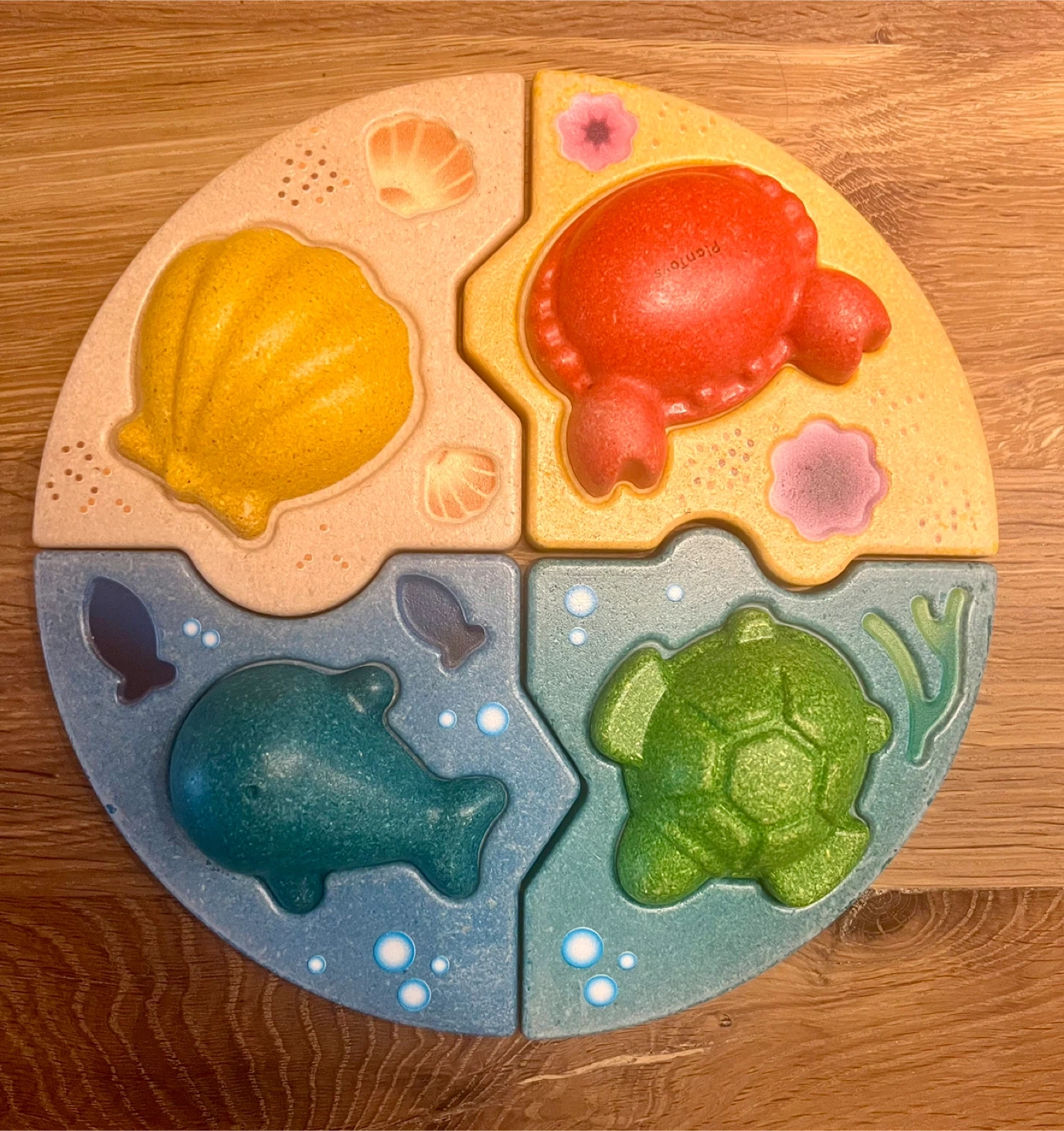This PlanToys Undersea Matching Puzzle is a fun and educational toy for kids! It features four colourful puzzle pieces with different sea creatures like a turtle, dolphin, a whale and a seashell. Great for developing matching skills and hand-eye coordination. Gently used.