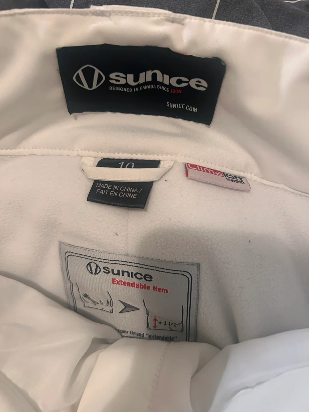 Selling a pair of Sunice ski pants in white. They're in great shape and ready for the slopes! These pants feature an extendable hem for a customizable fit.