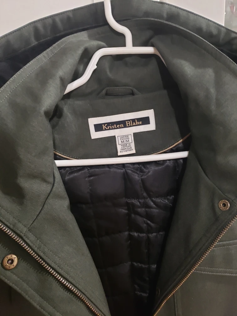 Women's dark olive green jacket. Features removable hood, long sleeves, multiple pockets, and a belt, fully lined and insulated Medium size. New but no tags