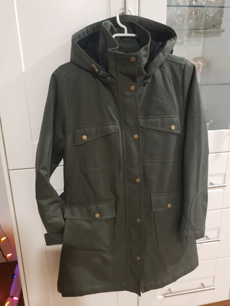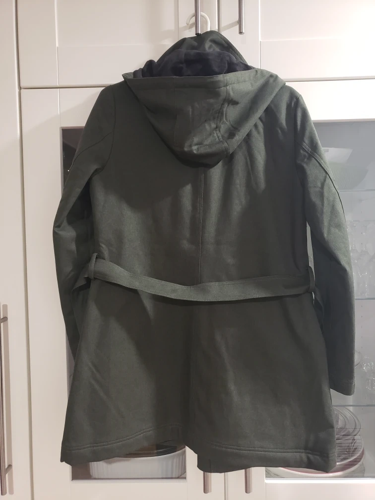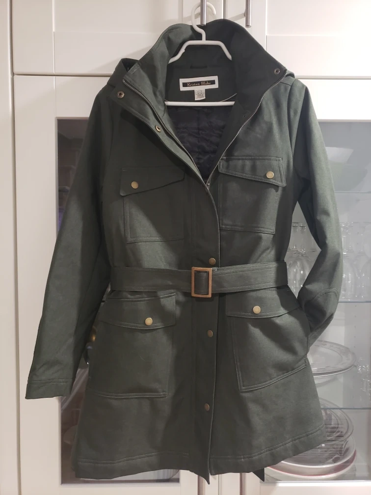 Women's dark olive green jacket. Features removable hood, long sleeves, multiple pockets, and a belt, fully lined and insulated Medium size. New but no tags