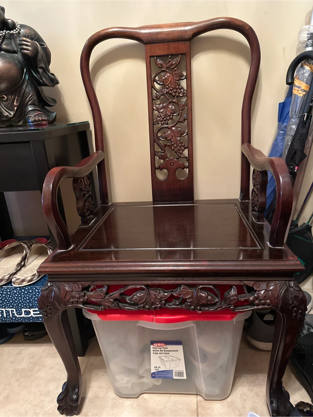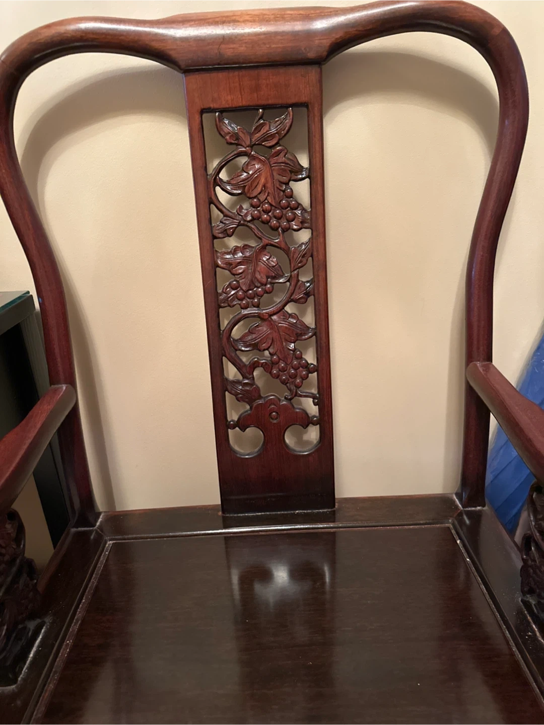 RedDark wood armchair with intricate grape and leaf carvings on the back panel and base. Features a smooth, polished seat and curved arms. This chair adds a classic touch to any room.