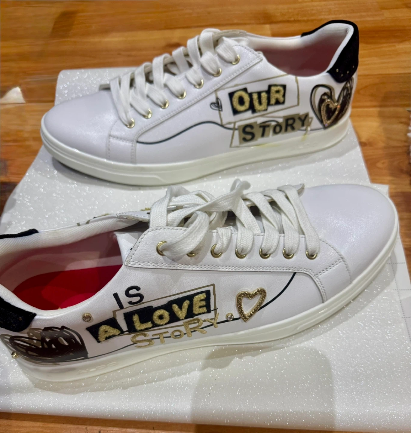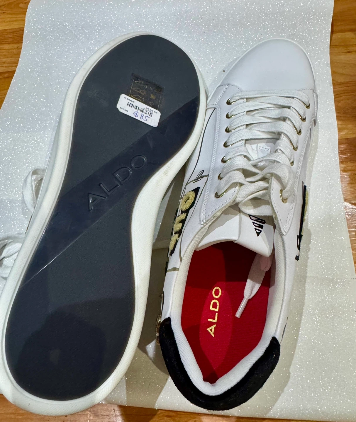 Cute Aldo white sneakers in great condition! They have a fun design with gold accents and black detailing. Size 12 Men