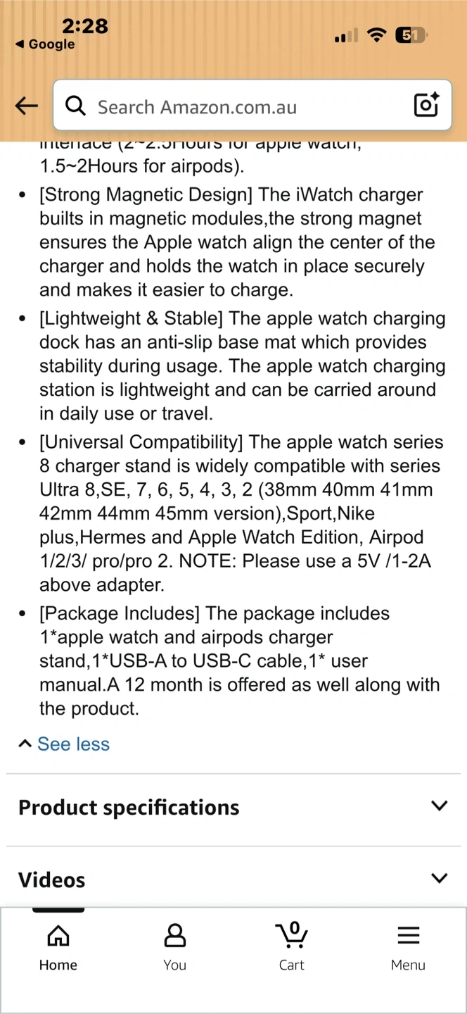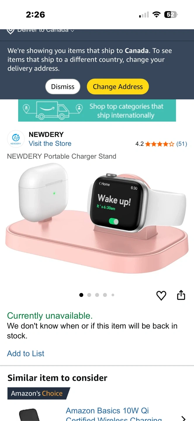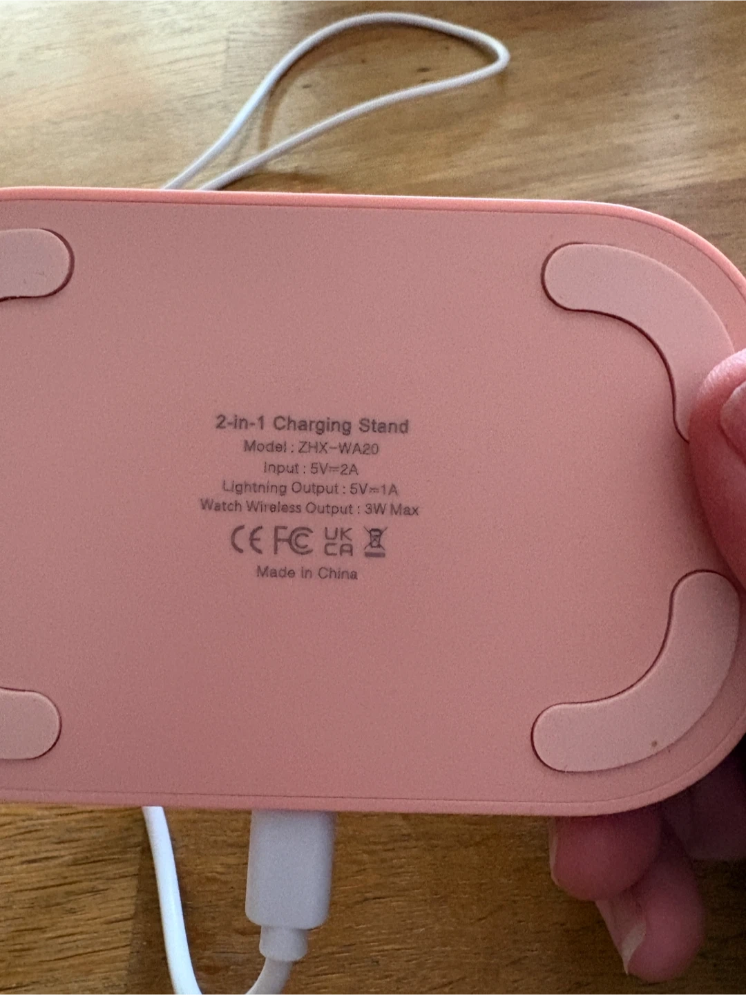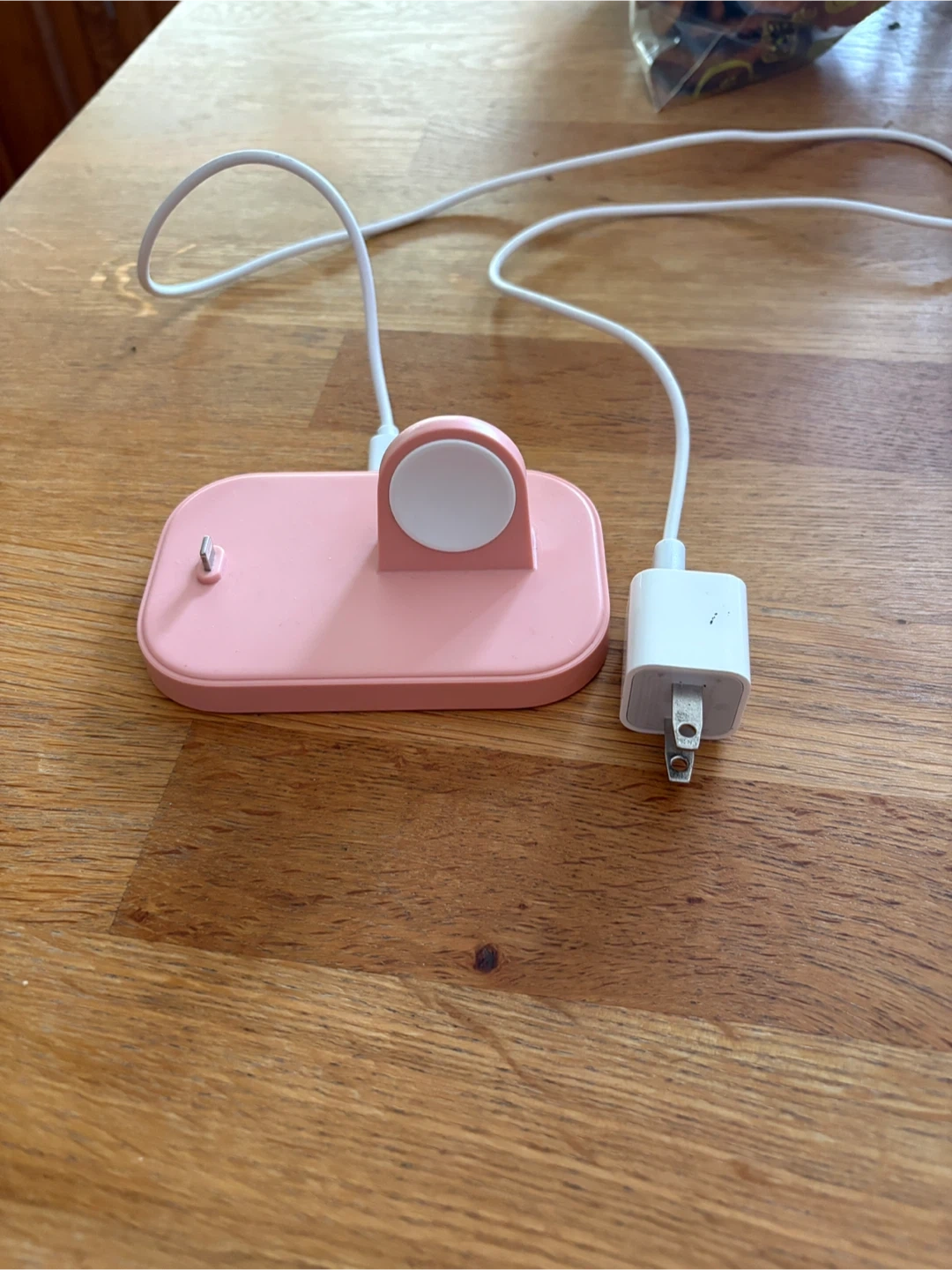 This pink charging stand is designed for your Apple Watch and AirPods. It features a dedicated spot for watch charging and a lightning connector for your AirPods. Keep your devices powered up and organized! Comes with cord and block.