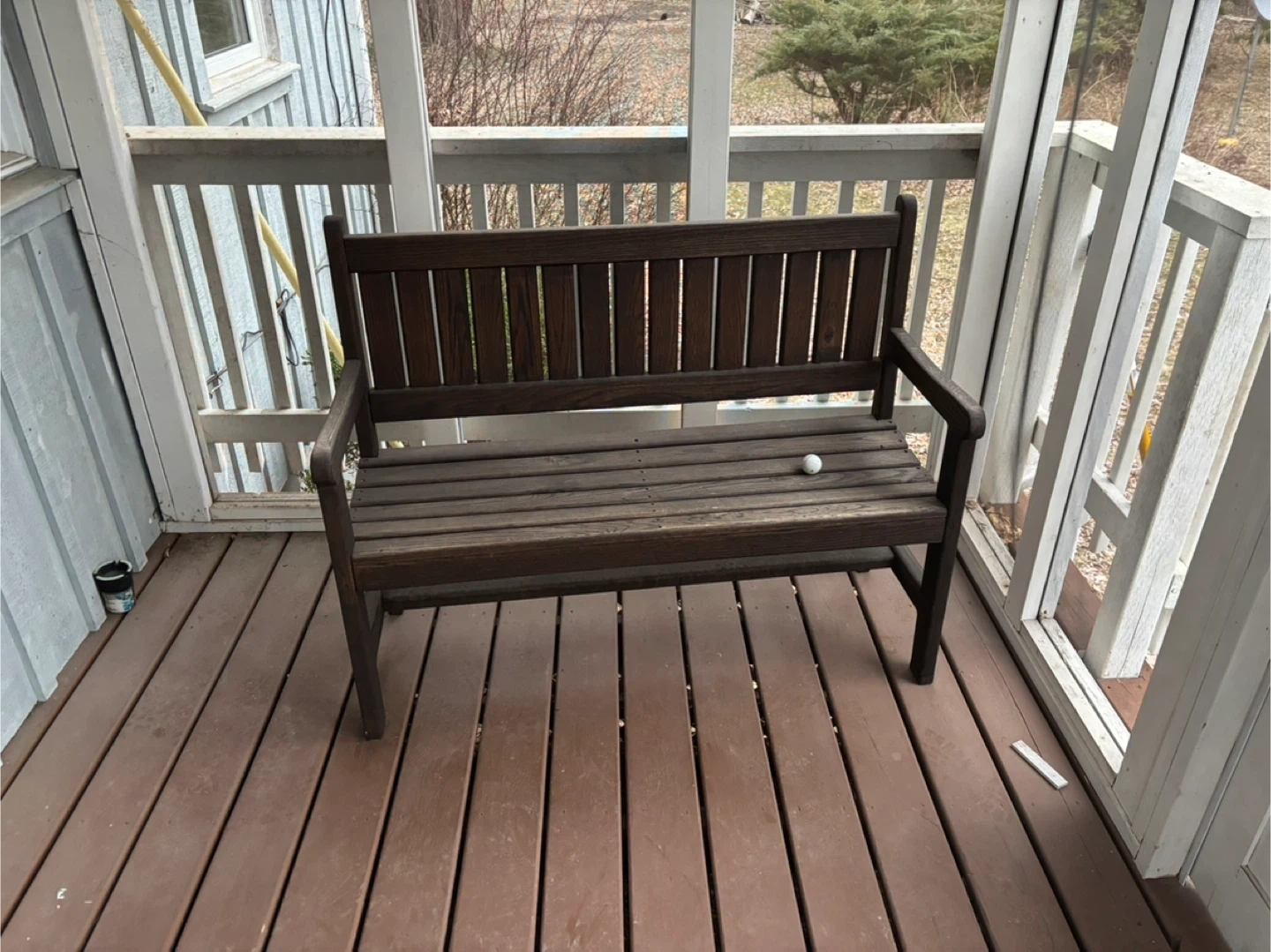 A sturdy wooden park bench with a slatted seat and backrest. Dark brown finish. Great for a porch or garden.
