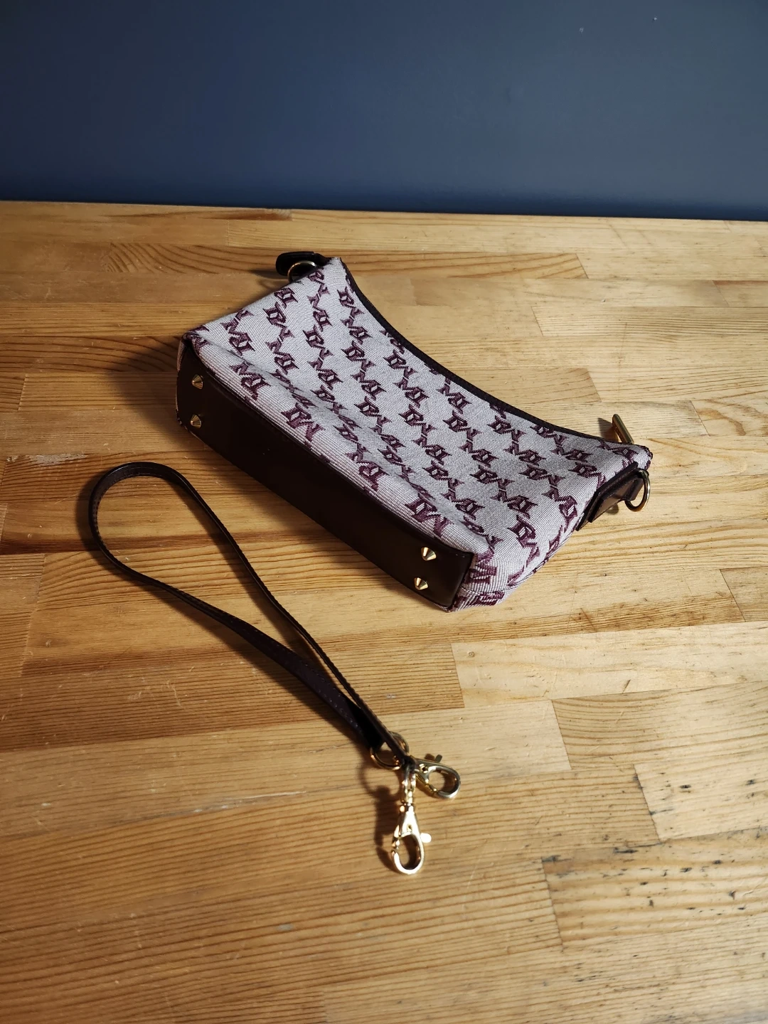- Material: Durable canvas or textile material with a logo monogram pattern and dark leather trim and strap.