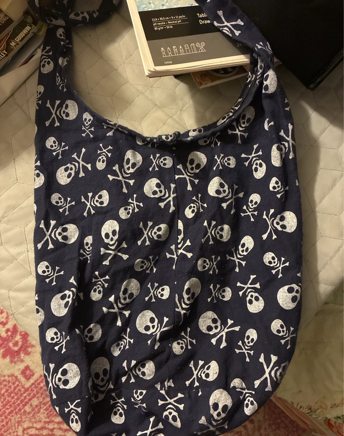 This navy blue messenger bag features an all-over skull and crossbones print. It's a great size for carrying everyday essentials. The button popped off but there’s a zipper. Cash only.