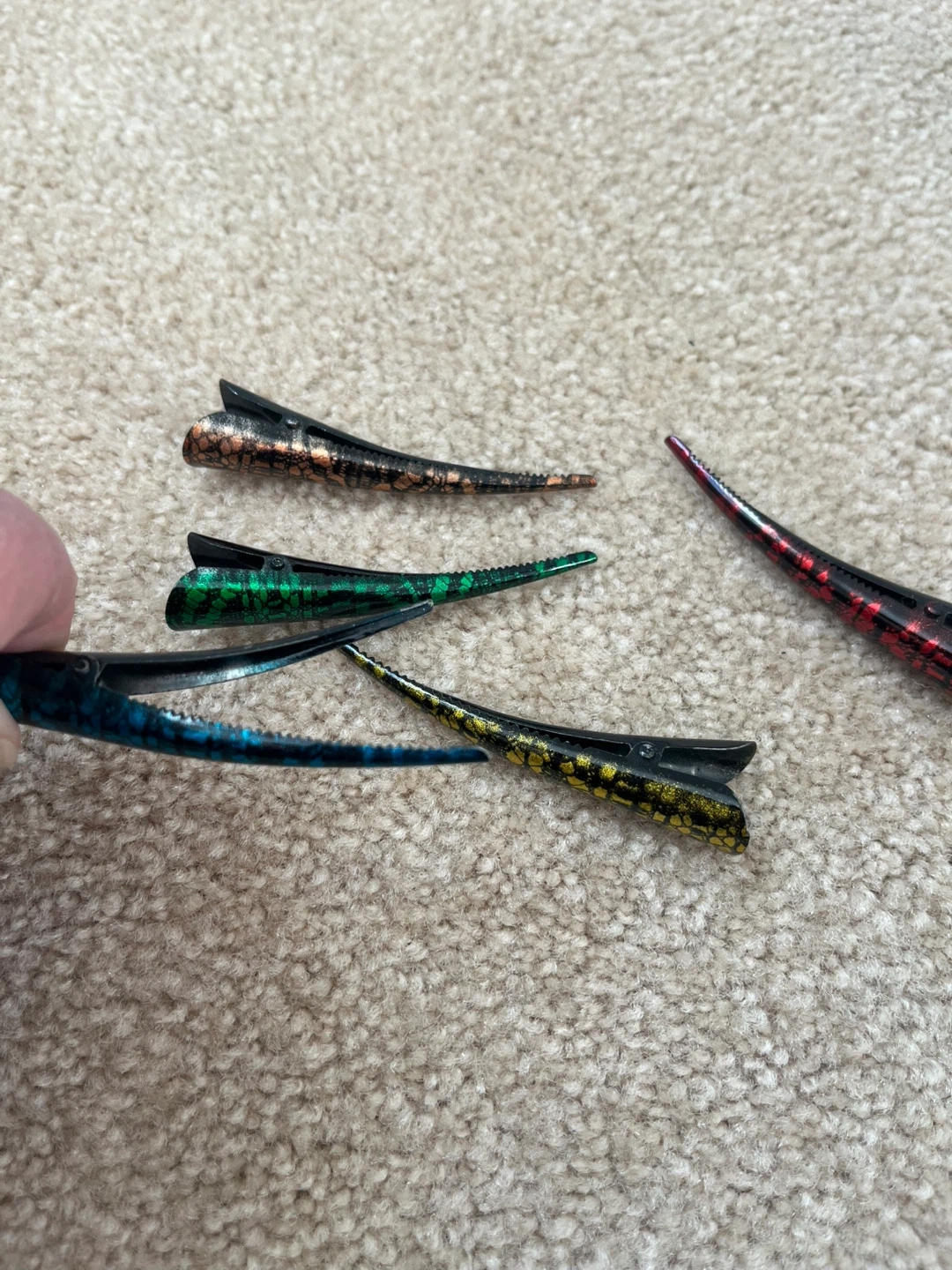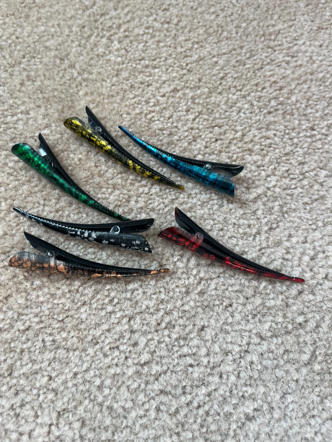 This set includes six alligator hair clips in various colours. These clips are useful for sectioning hair during styling or cutting.