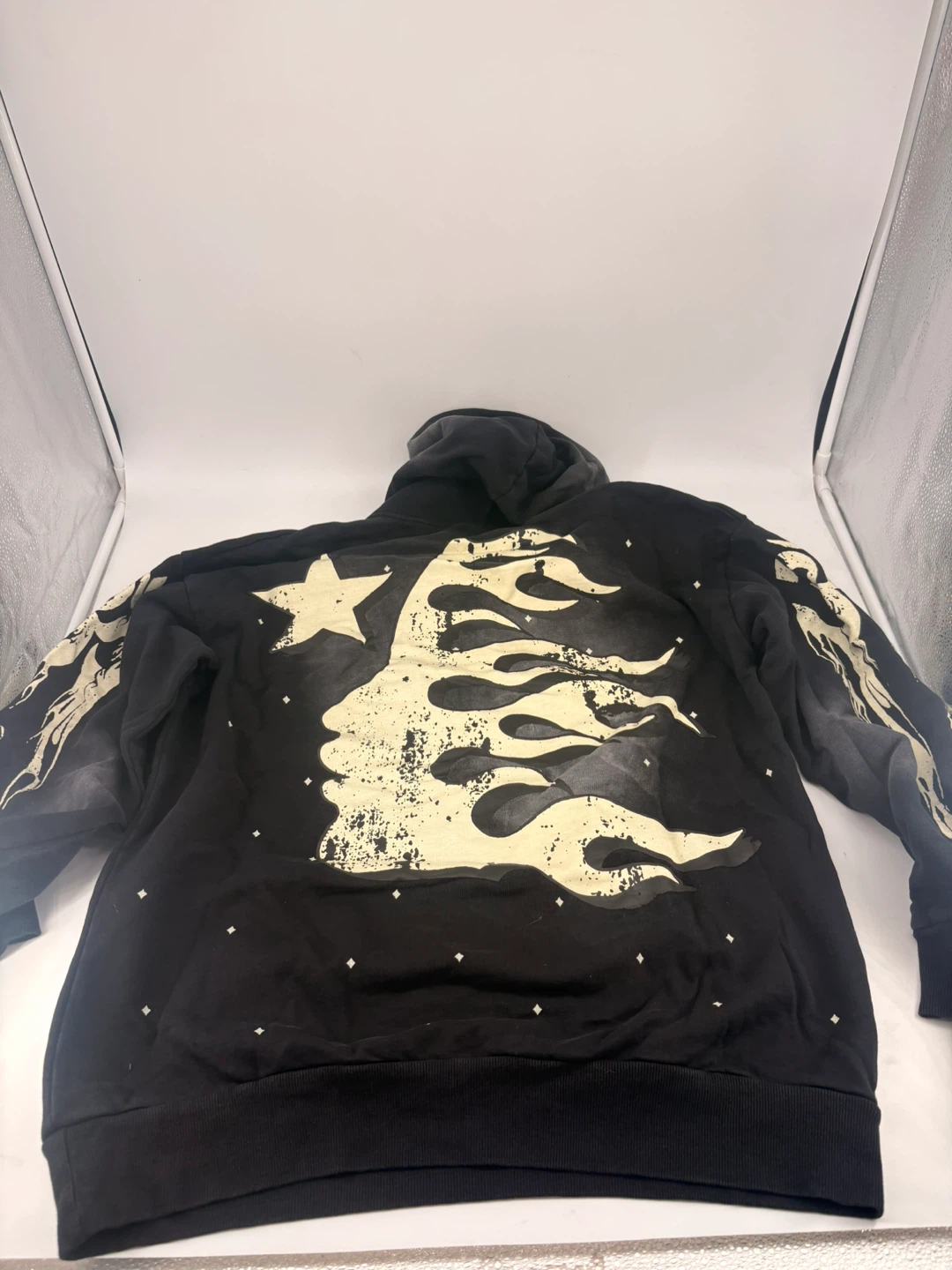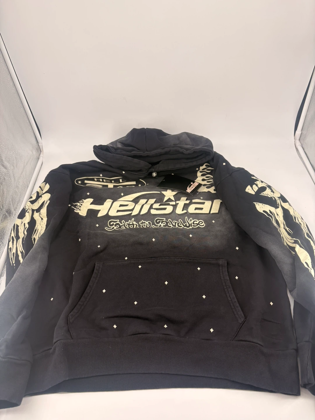 Selling a Hellstar 'Faith to Paradise' hoodie in black. It features a unique design with the brand's logo and graphics on the front and back. Comes with the original tag and packaging! NFC scans!!!