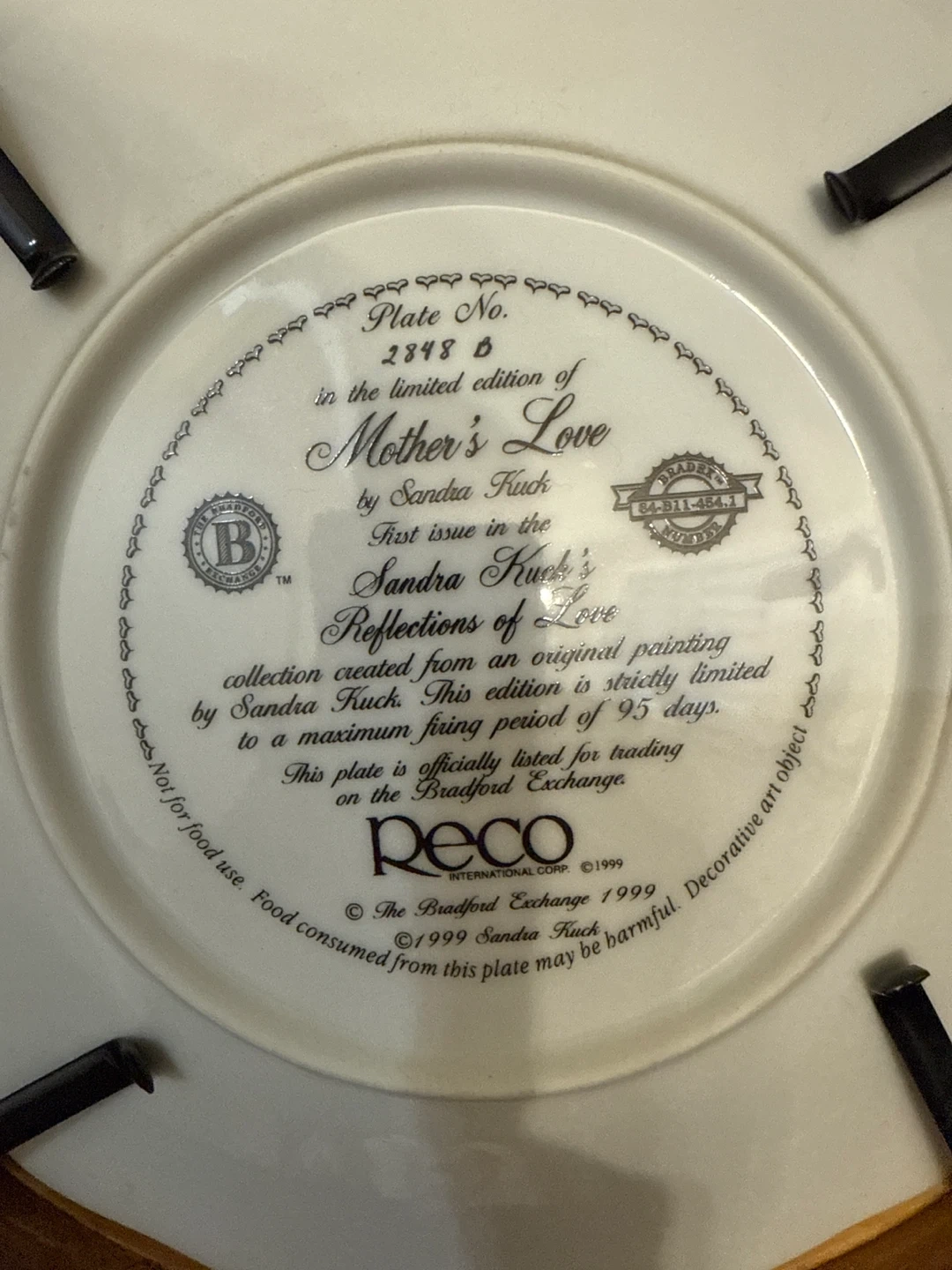This is 'Mother's Love', first issue in the 'Reflections of Love' collection by Sandra Kuck. It's a decorative art object from 1999. This plate is from a strictly limited firing period of 95 days. Not for food use.