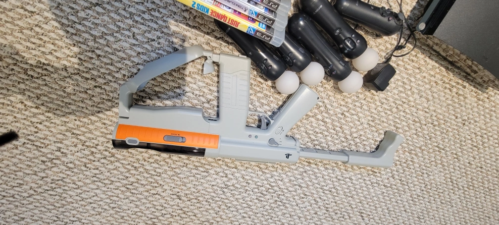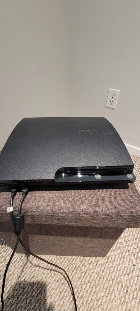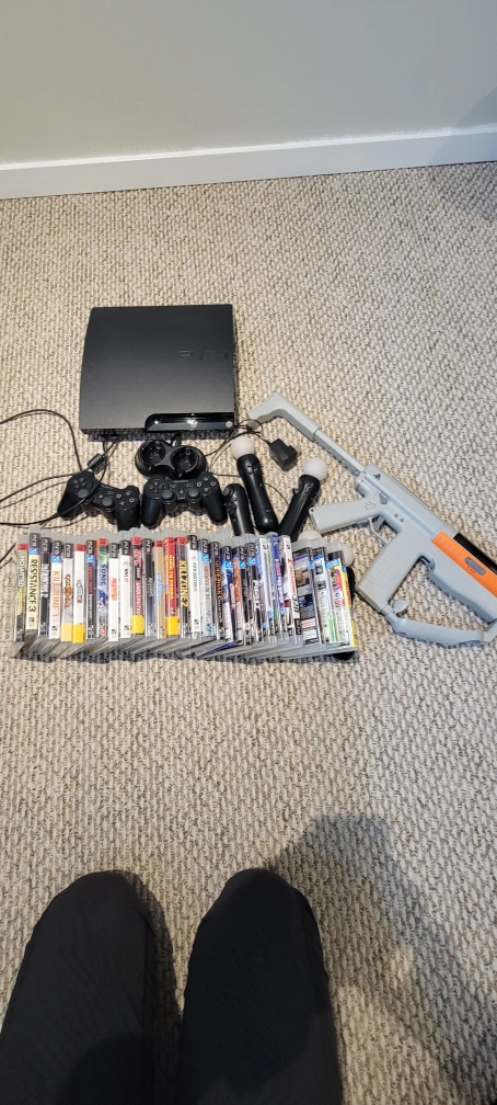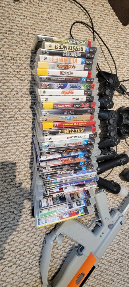 PlayStation 3 console with multiple controllers, move controllers, a gun peripheral, and a large collection of PS3 games. Includes all cords and cables. selling because bought PS5.