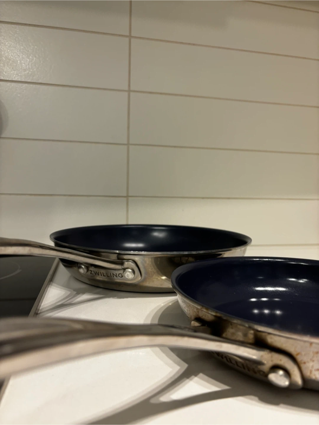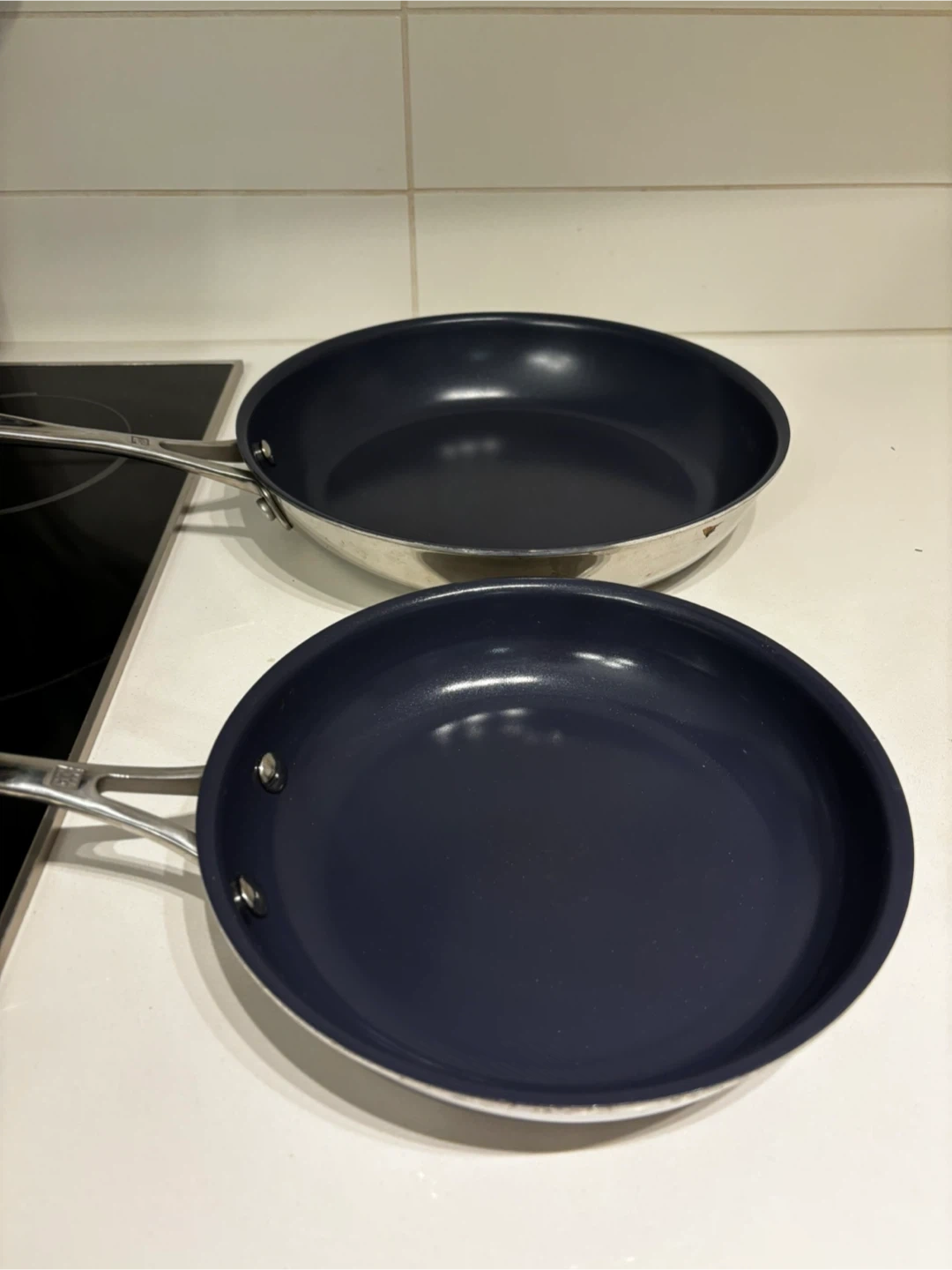 Two Zwilling frying pans with dark blue interiors and stainless steel handles. These pans are good for everyday cooking needs.